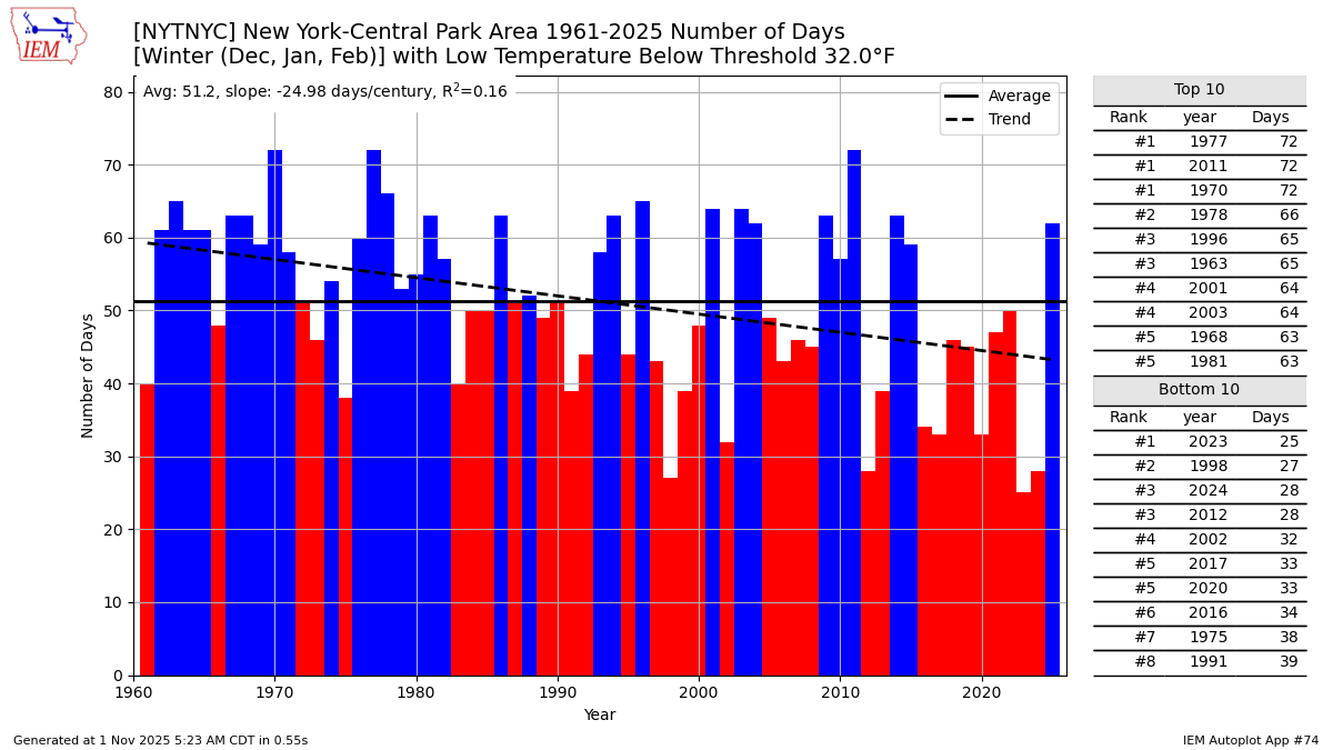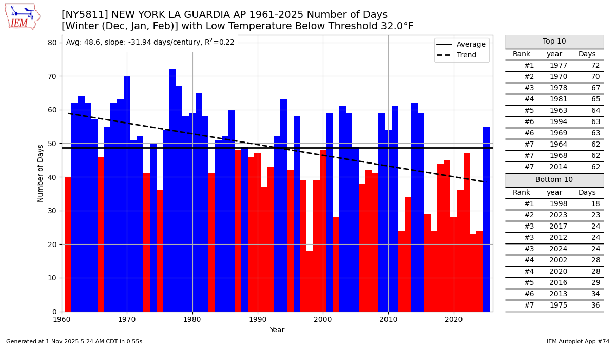 It’s tough to determine that NYC would be cooler on calm clear nights if the sensors were in a clearing instead of under the trees. Since the park is in the middle of one of the strongest heat islands in the country like LGA. So that makes the tree effects on radiational cooling nights harder to determine. We do know that the winter low temperature is warming a little slower than LGA. Plus LGA is often a few degrees warmer for the lows. So the lows have been warming at a faster rate at LGA than NYC. LGA is right on the water which keeps it warmer during the winter also. Data for December 1, 2024 through February 28, 2025 mean min temperature Click column heading to sort ascending, click again to sort descending. NY MONTAUK AIRPORT WBAN 32.6 NY LAGUARDIA AIRPORT WBAN 30.2 NY JFK INTERNATIONAL AIRPORT WBAN 30.0 NY NY CITY CENTRAL PARK WBAN 29.3 NY PORT AUTH DOWNTN MANHATTAN WALL ST HEL ICAO 29.3 NJ NEWARK LIBERTY INTL AP WBAN 28.0 NY RIVERHEAD RESEARCH FARM COOP 27.7 NY ORIENT POINT STATE PARK COOP 27.5