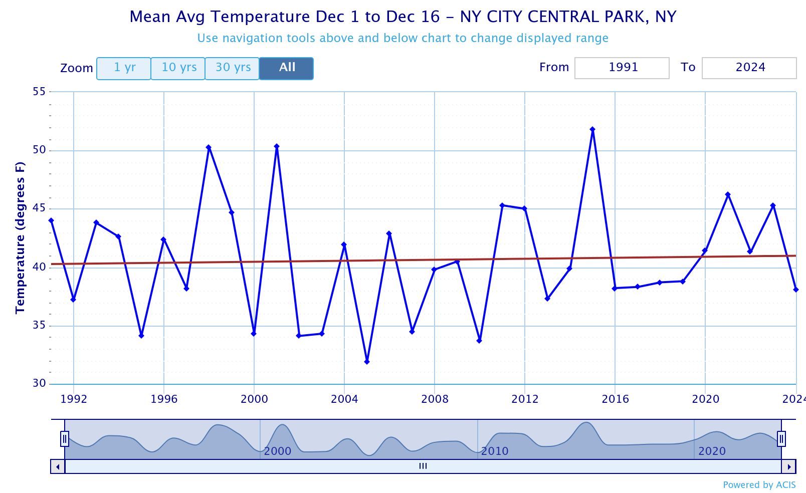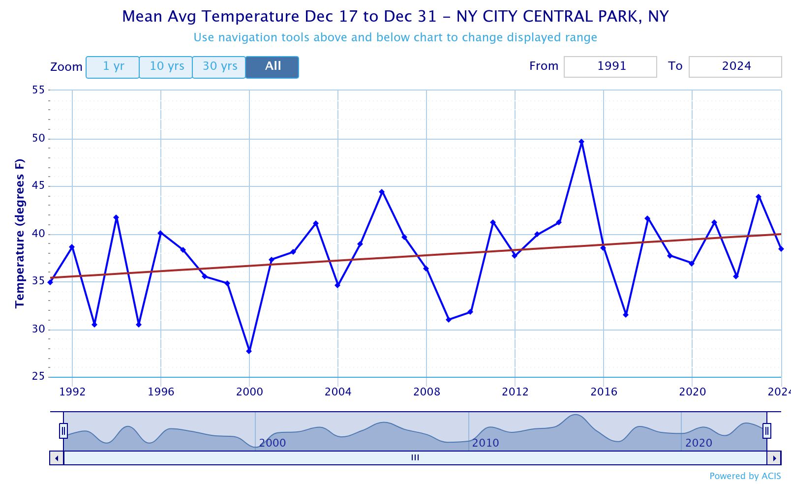 Colder start to December fits within the long term trend since 1991. NYC average temperatures have only risen +0.7° in NYC from December 1st to 16th. But the December 17th to 31st average temperatures over the same period have increased by +4.6°. This matches the streak of 55°+ days every year since 2011 around NYC from the 17th to 25th. So my guess is that the warmest departures we see this month will occur after the 16th. Time Series Summary for NY CITY CENTRAL PARK, NY highest temperature December 17th through 25th since 2011 Click column heading to sort ascending, click again to sort descending. 2024-12-25 59 0 2023-12-25 62 0 2022-12-25 58 0 2021-12-25 60 0 2020-12-25 61 0 2019-12-25 57 0 2018-12-25 61 0 2017-12-25 55 0 2016-12-25 58 0 2015-12-25 72 0 2014-12-25 62 0 2013-12-25 71 0 2012-12-25 56 0 2011-12-25 62 0