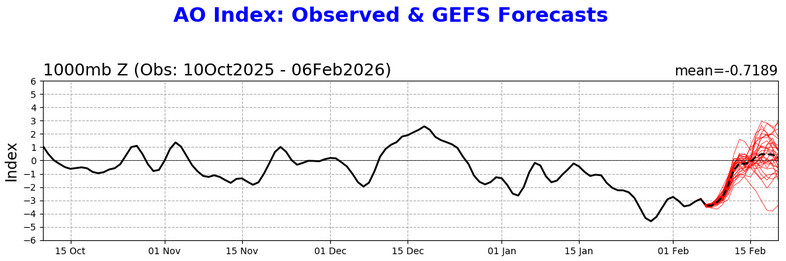 Uncertainty about the February 15-28 period has increased. What is fairly certain are the following: 1) Substantial warmup in the Plains States 2) Brief cool shot to the Southwest and then a return of warmer conditions. The cool shot likely won't be sufficient to preclude Phoenix from experiencing its warmest winter on record. Moderation is likely to occur across the Great Lakes Region, Northeast, Mid-Atlantic, and Southeast during and after February 10th. What happens beyond 7-10 days is where things become increasingly uncertain. The CFSv2 favors a continuation of above normal temperatures through the end of February. The ECMWF weeklies bring colder conditions for the February 23-28 period. CFSv2: ECMWF Weeklies: Even as wave lengths are shortening, the Arctic Oscillation (AO) could hold the key. The EPS and GEFS agree on the development of a WPO-, EPO+, PNA- pattern. During such patterns, conditions in the East tend to be much colder when the AO is negative than when it is positive. New York City provides a good example. Since 1980, WPO-, EPO+, PNA-, AO- patterns have seen a mean February 15-28 temperature of 33.9°. In contrast, WPO-, EPO+, PNA-, AO+ patterns have seen a mean temperature of 44.5°. So, if the AO goes positive, the warmth from the Plains will likely come eastward. WPO-, EPO+, PNA-, AO- Patterns: WPO-, EPO+, PNA-, AO+ Patterns: The latest AO forecast is below. A near neutral AO would favor near seasonable to somewhat above seasonable temperatures in the East. As noted previously, due to shortening wave lengths, the consensus outcome of a resumption of above normal temperatures in the Southwest to close out February is the base case. -