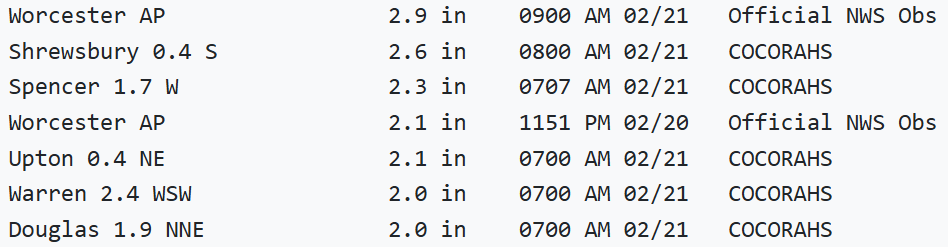 Working my way backward, finally finished this slop event. It's been hard to keep up with all these C-3 type events. Forecast for this was pretty much excellent for CT. A- Oh and the BOX PNS is pretty hilarious. TWO ORH reports included and both of them are wrong . The final for ORH was 2.4
