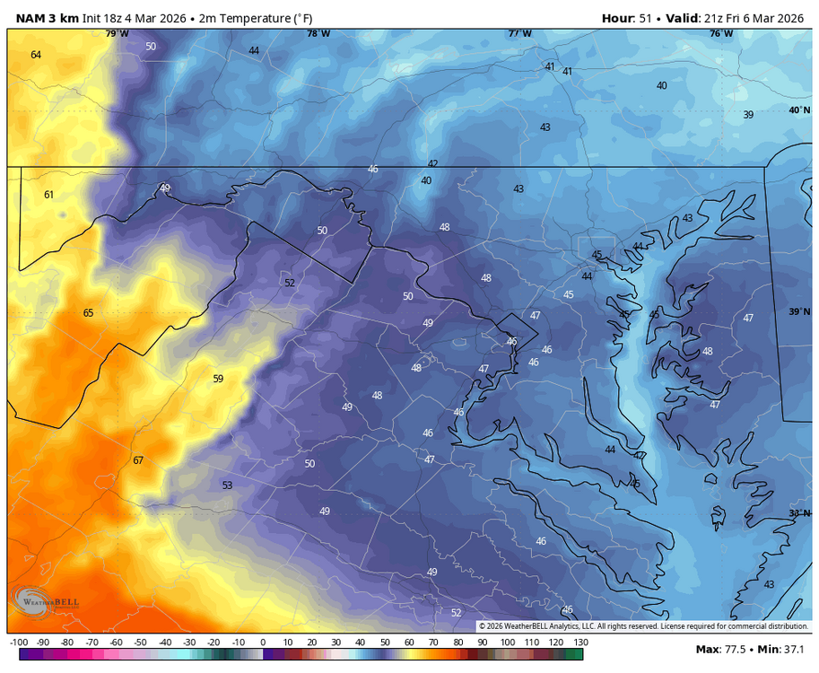 Low of 48, high of 79.5. Dew points up to the low 60's today.