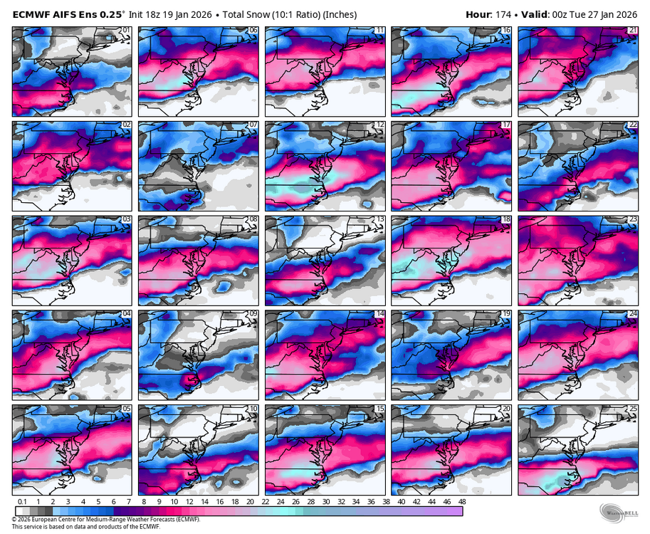 Today we start to cross the HR120 (D5) threshold. Should see the guidance really tighten up over the next 24 hours. Would caution folks here that might result in some extreme solutions getting eliminated and thus, reducing a mean snowfall here or there. That does not mean this is "trending towards a bust", but rather just narrowing towards a better forecast.