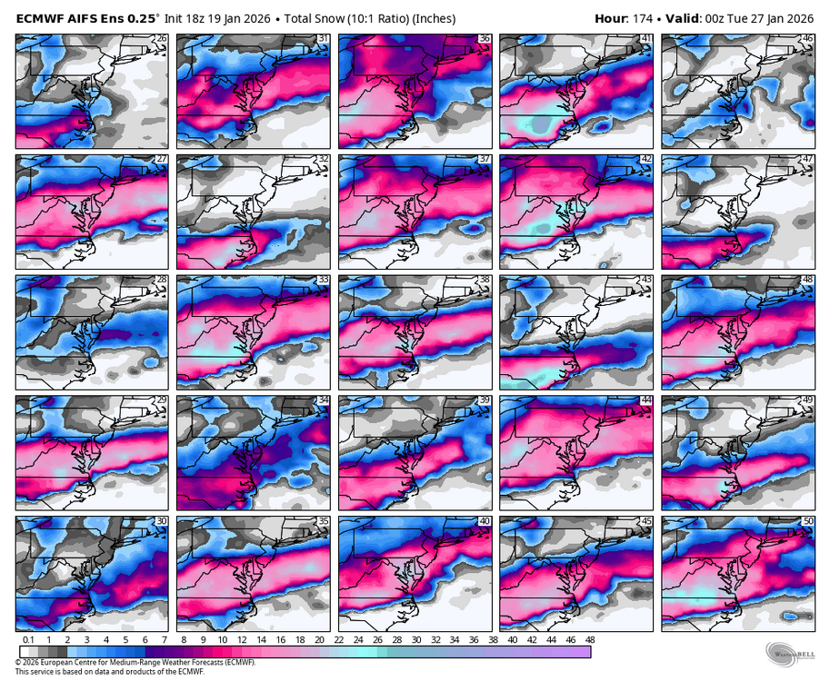 Posting this for our upper Delmarva, northern MD folks. The 12z "traditional" Euro EPS really upped the ante for Philly. Several double digit hits, and only a few duds (less than 3"). Out of 50 members, I only count 11% (6 members) with less than 3" of snow. Everything else is warning level or better. Again, what a signal from Dr. No at this range.