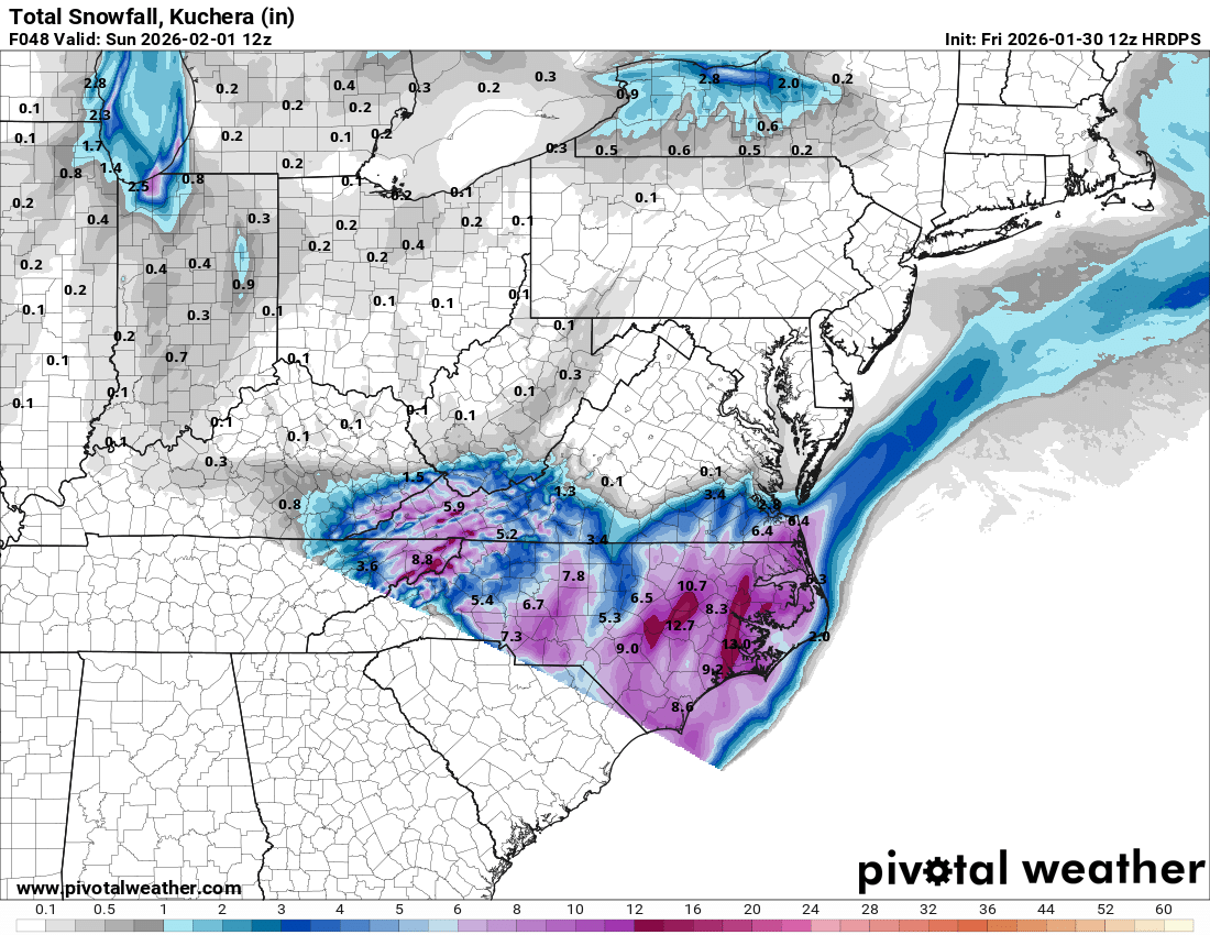 I looked at the mountain point forecast last night and it had -36 degree chills overnight Sat into Sunday at my location. That is crazy. It's backed off a tad today, but that was impressive to see. The bitter chills obviously don't take center stage in these events, but folks need to keep in mind that these will be frigid times in the next few days. We will have high winds, so power outages could be on the table in spots. Always be prepared.