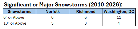 My position is as follows: ...any structural decline in seasonal snowfall from an overall warming of winters probably won't be evident until the mid-2030s due to stochastic variability. Moreover, there will continue to be some big snowstorms (even if the recent big snowfall drought skews perceptions) and snowy winters. Winters can still feature cold. December 2025 is an example, as it's on course to be the coldest December in 15 years in NYC. https://www.americanwx.com/bb/topic/62460-snow-potential-dec-26-27/?do=findComment&comment=7876310 Washington, DC with its warmer climate than NYC provides a classic example with Winter 2009-10. Norfolk, Richmond, and Washington, DC have all see a number of significant and major snowstorms since 2010 with climates that are warmer than New York City's will be even a decade or more in the future. -