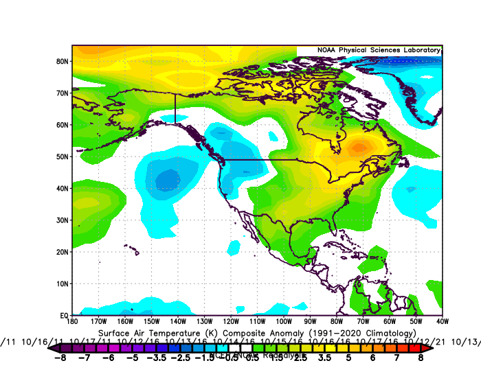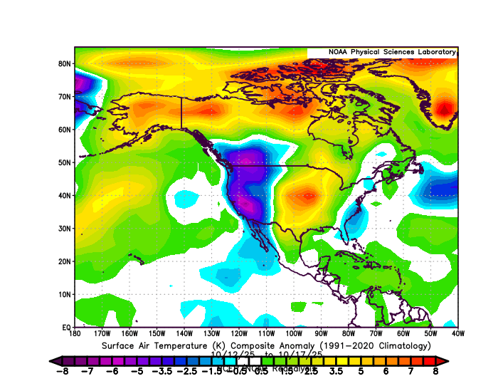Analogs, because they are derived from boundary conditions, do not capture synoptic details. Thus, very short timeframes aren't great for assessing them. Periods of 1-3 months provide greater assessment value, as things essentially average out from a series of synoptic events. In theory, the better analogs should come up with a reasonable but not perfect approximation of the 1-3 month period. As North American data is available for October 12-17, I used that to make some comparisons: 2013-2024 Composite: 2011-2016-2021 Experimental Statistically-Generated Cases (discussed earlier in this thread): Actual: October 12-17, 2025: Overall, the actual 2025 data is more amplified than the composite analog cases, aside from spatial differences e.g., misaligned areas of cold and warm anomalies. These kind of differences are to be expected at the very short timeframes used, as synoptic details outweigh boundary conditions at such timeframes. If there is value in either set of analogs, that would become evident over the longer periods of time where boundary conditions outweigh synoptic details. -