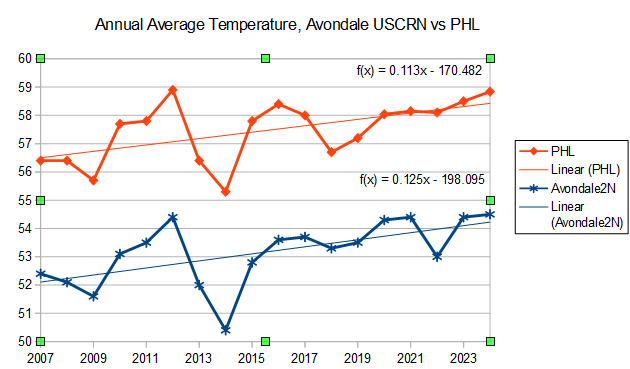 A usual you are ignoring the evidence I posted or don't understand. Lets make it simple. Here is the Avondale USCRN station, our best local station, and the Philadelphia Airport (PHL). Since its start-up, Avondale has warmed at .125F per year or 1.25F per decade. Over the same period, PHL has warmed by .113F per year or 1.13 per decade. The same numbers are in the table I posted. The table shows similar results for the 12 DEOS stations, KMQS, Phoenixville etc. All warming at a similar rate as PHL. Clear and overwhelming evidence that Chester county is warming at the same rate as the Philadelphia Airport.