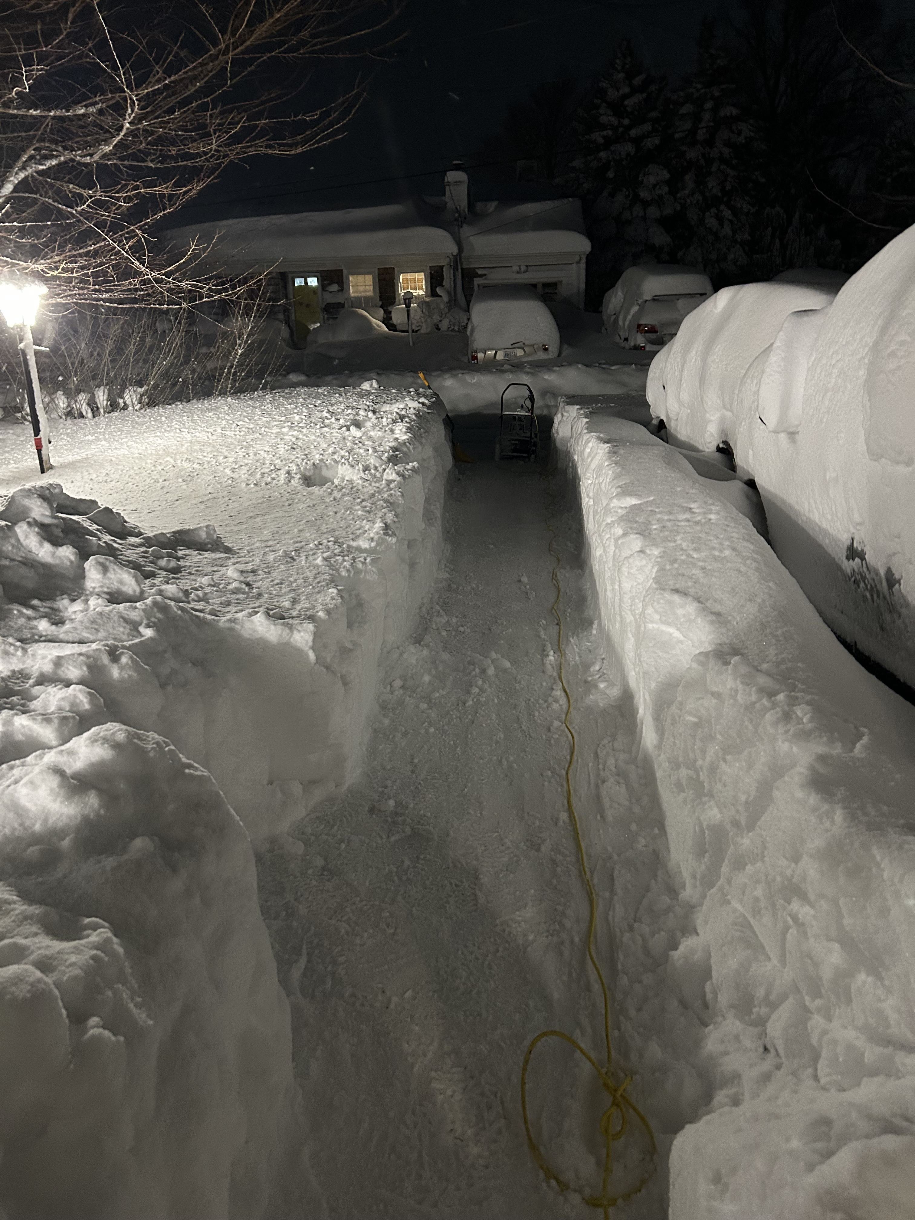 Checking in from Plymouth, south of downtown on 3A. 6’ drifts, impossible to measure. No state plows all day. Lost half a dozen shingles on my new roof. No power since 7am. Wood stove cranking, kids asleep. Making memories. -
