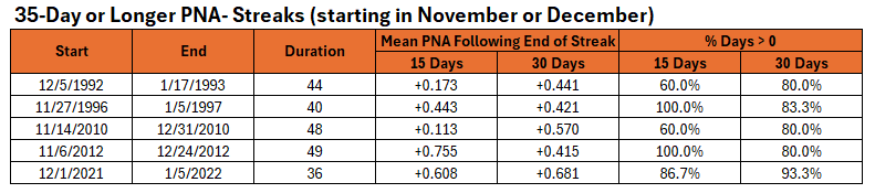 The ongoing PNA- will eventually end, even if the 0z GEFS sustains it through its forecast period. Once that happens, recent historical experience (since 1980) suggests that the PNA will likely undergo a regime change to mainly positive values. The same kind of regime change took place for all 10 25-day or longer streaks that began in November or December. -