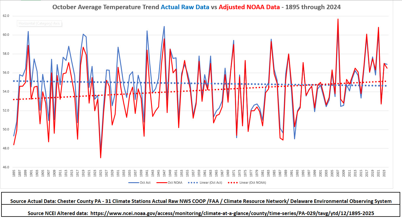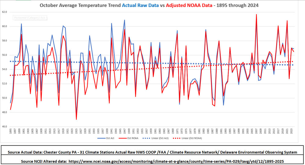 With below normal temperatures continuing this week here in Chester County PA to close out October we will finish the month with below normal temperatures. This is the 5th month of the 10 months here in 2025 to feature below normal readings. Overall this will be a Top 50 cool October across 133 years of records. As you can see below this will continue our relative overall actual raw data cooling trend for Octobers since the 1890's.