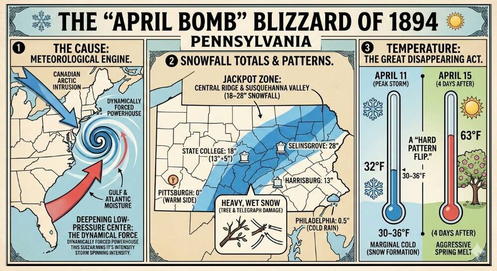My first post of maybe several in coming days if people enjoy it. These are about true rarity in these parts that used to be a whole lot less rare. April Blizzards This is a deep dive into the "April Surprise" of 1894, a legendary late-season monster that paralyzed Pennsylvania just as the state was beginning to bloom. [emoji2518] 1894: A World, Nation, and State in Flux In April 1894, the world was a study in contrasts. Globally, the Panic of 1893 was still casting a long economic shadow, leading to significant labor unrest. In the United States, "Coxey’s Army"—the first significant popular protest march on Washington, D.C.—was tramping through the mud of the Midwest and Mid-Atlantic, demanding jobs just as this blizzard struck. Locally, Pennsylvania was the industrial heart of the nation; the steel mills of Pittsburgh were roaring, and the coal mines of the Anthracite region were fueling the Gilded Age. Culturally, the 24th President, Grover Cleveland, was in office, and the first ever Stanley Cup championship had just been played weeks prior. Little did Pennsylvanians know that a "Second Winter" was about to descend with historic fury. [emoji3587] The Winter 1893-94 Lead-Up: February’s Peak The winter of 1893–94 wasn't a consistent "ice box" year; rather, it was a season of extreme pulses. The early winter was relatively quiet, but February 1894 became the soul of the season. February saw a staggering 1,401.8" of station-summed snowfall across the state network—nearly triple the amount seen in January. The coldest day occurred on February 25, when the statewide average minimum temperature plummeted to -1.3°F. However, as March arrived, the "spring flip" was aggressive. Temperatures surged into the mid-50s, the snow pack vanished, and by early April, fruit trees were budding and farmers were eyeing their fields. The atmosphere was primed for a clash of seasons. [emoji408] Monthly Statistical Summary (Pre-Blizzard) | Month | Stations Reporting | Snow Sum | Mean Tmax | Mean Tmin | |---|---|---|---|---| | 1893-11 | 53 | 48.0" | 47.8°F | 32.6°F | | 1893-12 | 56 | 255.7" | 40.7°F | 24.6°F | | 1894-01 | 82 | 472.9" | 40.7°F | 25.4°F | | 1894-02 | 82 | 1401.8" | 36.7°F | 18.8°F | | 1894-03 | 82 | 97.1" | 54.0°F | 32.6°F | | 1894-04 (1–9) | 83 | 100.6" | 49.4°F | 32.0°F | [emoji302] The "April Bomb": April 10–12, 1894 The blizzard was not a classic "Arctic Blast" but rather a dynamically forced powerhouse. On April 10, a deepening low-pressure system began drawing massive amounts of moisture from the Atlantic, crashing it into a marginal but stubborn cold air mass draped over the interior of Pennsylvania. While Philadelphia saw mostly a cold, driving rain (only 0.5" snow) and Pittsburgh remained on the "warm" side with 0.0", the Central Ridge-Valley and Susquehanna Valley became the "Jackpot Zone." On April 11, the storm reached its peak, with 54 stations reporting snow and a statewide station-sum of 411.4" in a single 24-hour window. [emoji2783] The 9-Day Timeline (The Setup, The Event, The Melt) | Date | Mean Tmax | Mean Tmin | Stations w/ Snow | Max Single-Station Snow | |---|---|---|---|---| | Apr 7 (Pre) | 41.8°F | 29.7°F | 23 | 6.5" | | Apr 10 (Start) | 41.9°F | 31.1°F | 38 | 10.0" | | Apr 11 (Peak) | 36.7°F | 30.0°F | 54 | 28.0" | | Apr 12 (End) | 43.6°F | 31.6°F | 18 | 4.0" | | Apr 15 (Melt) | 63.0°F | 32.5°F | 0 | 0.0" | [emoji625] Geographic Winners and Losers The 1894 blizzard was a masterclass in "mesoscale banding." While the big cities on either end of the state (Philly and Pittsburgh) saw very little, the interior was buried. Selinsgrove recorded a mind-boggling 28.0" on April 11 alone. State College was a consistent winner throughout the event, recording 18" over two days. This storm was a "wet" snow, meaning the weight on the newly budding trees and telegraph lines was catastrophic, causing widespread communication blackouts across the Susquehanna Valley. [emoji471] Top Station Totals (April 11 Peak) * Selinsgrove 2 S: 28.0" * Le Roy: 22.0" * Lewisburg: 20.0" * Coatesville: 18.5" * Lebanon: 17.5" * Harrisburg: 13.0" [emoji2410] The Aftermath: The Great Disappearing Act As quickly as the winter monster arrived, it vanished. By April 13, the sun came out and temperatures began to climb. By April 15, the statewide average maximum temperature hit 63°F, sending the massive snowpack into a rapid melt. This led to localized flooding as the heavy, wet "April White" turned into "April Water." For those living through it, the 1894 blizzard was a reminder that in Pennsylvania, winter is never truly dead until May. [emoji2793] Visualizations I am generating a snowfall map of the hardest-hit locations and a commemorative "Weather Lore" infographic for the board. Here is the detailed write-up for your weather message board, formatted for easy copy-and-paste. [emoji2518] 1894: A World, Nation, and State in Flux The spring of 1894 arrived at a pivotal moment in history. Globally, the Panic of 1893 was still casting a long economic shadow, fueling labor unrest and leading to the historic march of "Coxey’s Army" toward Washington, D.C. In Pennsylvania, the Gilded Age was in full swing; steel mills and coal mines were the engines of the nation, and Grover Cleveland sat in the White House. While the state was looking forward to the regrowth of spring, a "Second Winter" was quietly gathering strength in the atmosphere. [emoji3587] The Winter 1893–94 Lead-Up: February’s Peak The 1893–94 season was one of extremes rather than consistency. After a quiet start, February 1894 became the heart of the winter, delivering a staggering 1,401.8" of station-summed snowfall across Pennsylvania—nearly triple the volume of January. The season’s arctic peak occurred on February 25, with a statewide average low of -1.3°F. However, March brought a violent "spring flip," with average highs surging into the mid-50s and the snowpack rapidly vanishing. By early April
