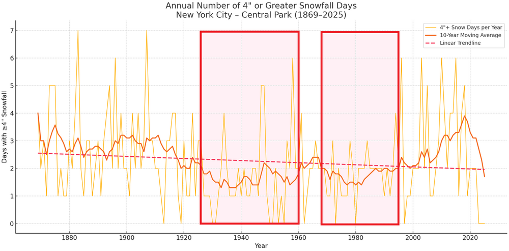 Yes. Since 2020, Pittsburgh has had 7 such days while New York City has had 6. Temperatures have not warmed so sharply and abruptly that such storms are precluded. I suspect that this winter will see at least one such day in both cities. It should also be noted that New York City has gone through two long stretches where 4" or above snow days were infrequent.