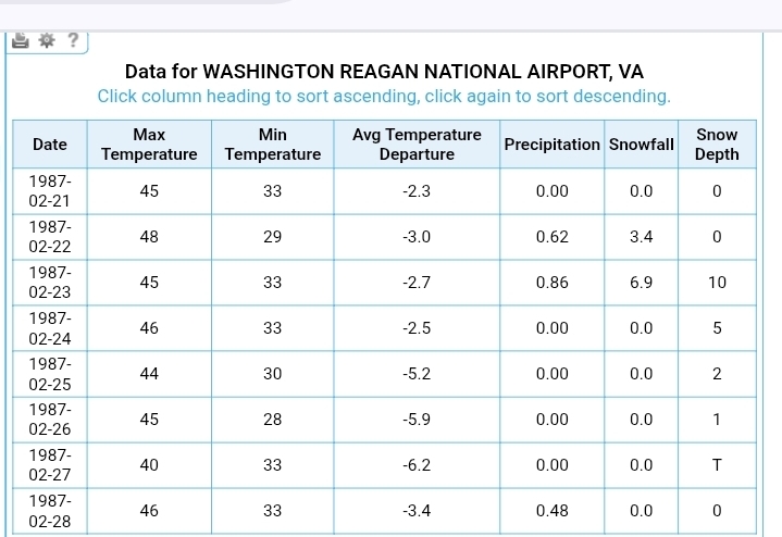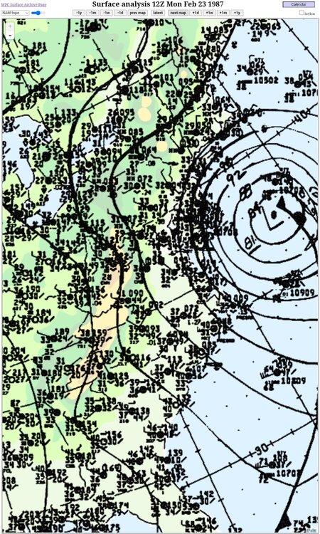 As y'all have noted, it will all come down to the rates. While not quite the same sfc low track (at least what's being forecasted), the Sun night-Mon morning snow Feb 22-23 1987 was one that I remember where rates overcame surface temps around 33 during the storm in the metros. The high was actually a balmy 48F at DCA 7 or so hours before the snow started. Areas north and east were able to cash in much better in this event because of their thermals. I believe this event gave parts of southern PA over 20". Low was more tucked towards the VA Capes initially. -