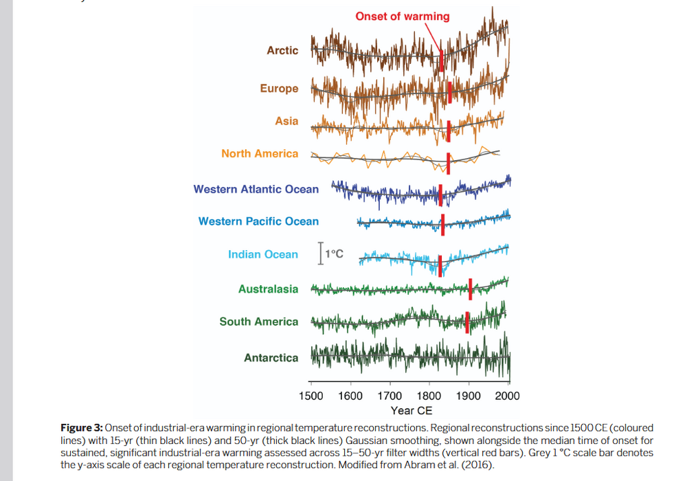 Found this 2017 article in the Pages2k magazine that provides a nice summary of regional temperature change since 1500. There is regional variation in the detectable onset of man-made warming. As you suggest warming was already detectable by the mid-1800s over the ocean and Northern Hemisphere land masses. Makes sense as greenhouse gas concentrations started to rise slowly by 1800. https://pastglobalchanges.org/sites/default/files/download/docs/magazine/2017-1/PAGESmagazine_2017(1)_71-74_2k.pdf