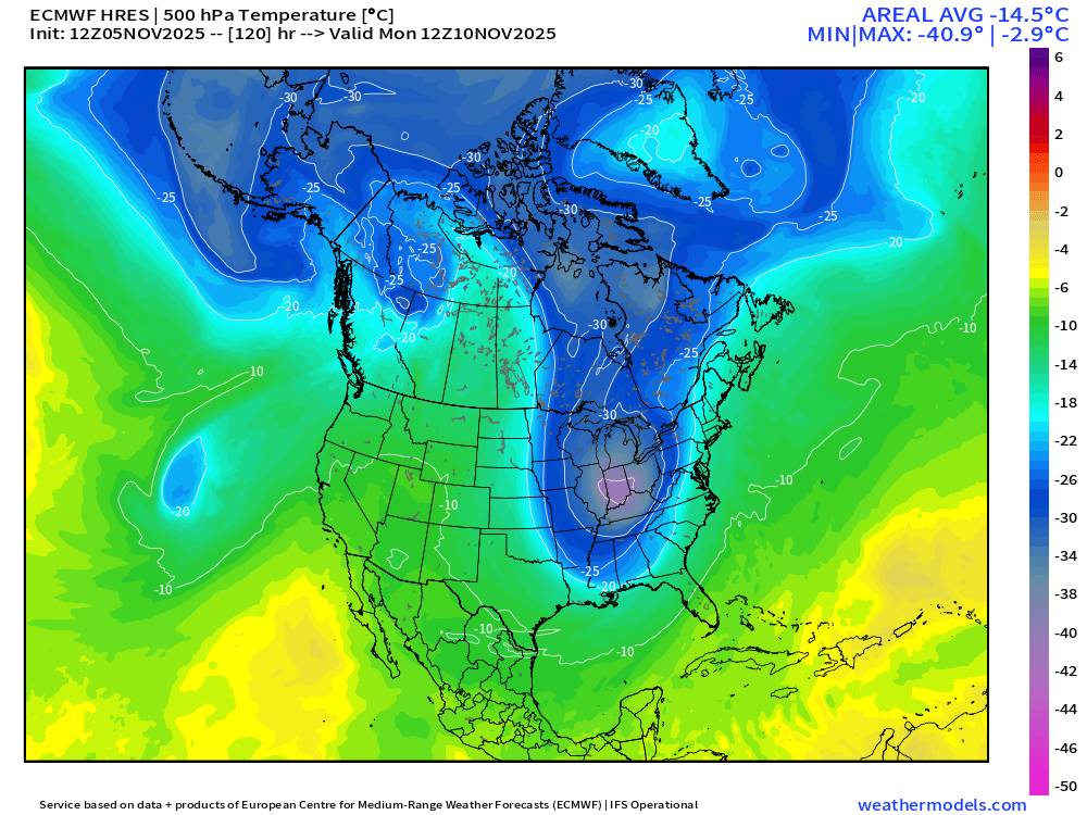 From Ryan Maue Just exclaimed to an esteemed colleague how gobsmacking it was to see -40°C contour at 500 mb over Indiana on November 10th -- so unlikely to be nearly impossible in 2025 let alone 175-years ago in 1850. Historic cold -- we get to experience the pre-industrial climate in 2025! This is extremely impressive. Sent from my SM-G998U using Tapatalk