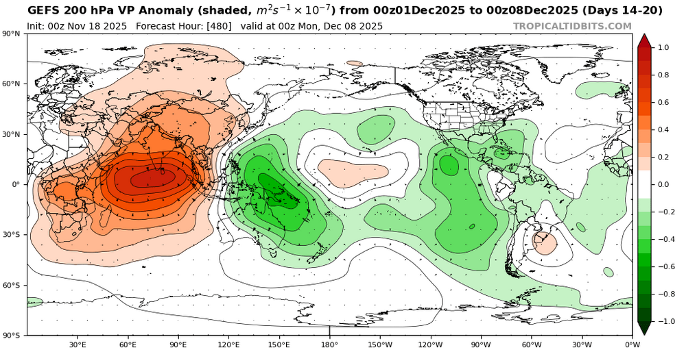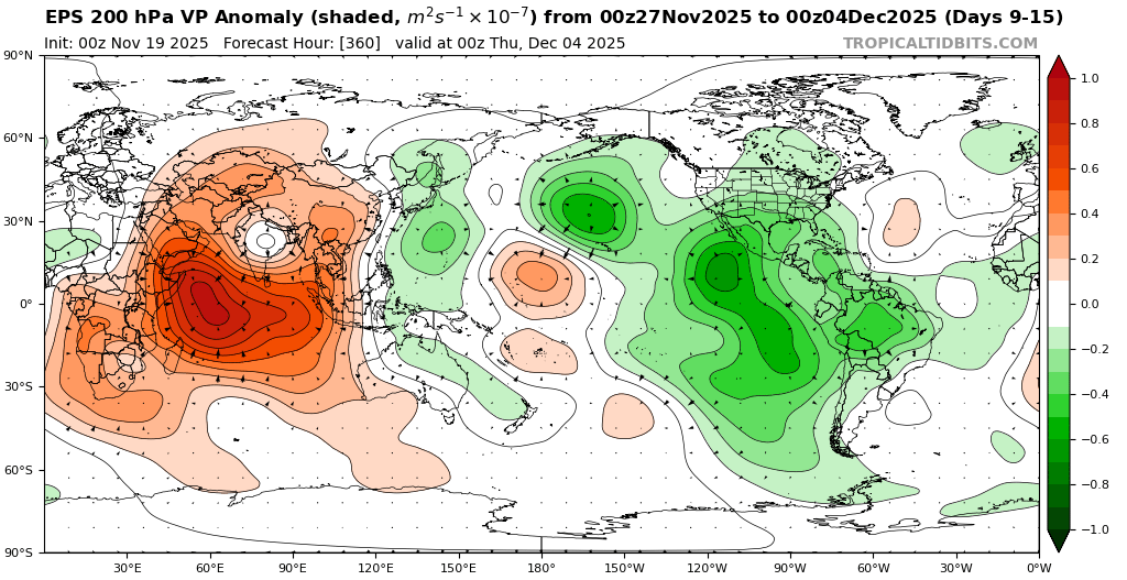 We may not get a clean translation of any of the specific MJO 7 composite to start December since the models are showing more of a split forcing pattern. Notice the forcing lingering near the Maritime Continent at the same time there is forcing over the Western Hemisphere. So the current forecast has more of blended look between competing influences.