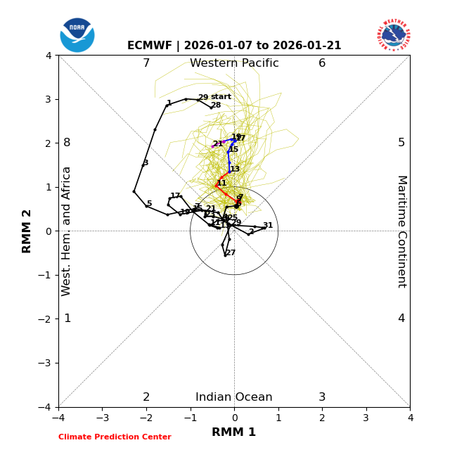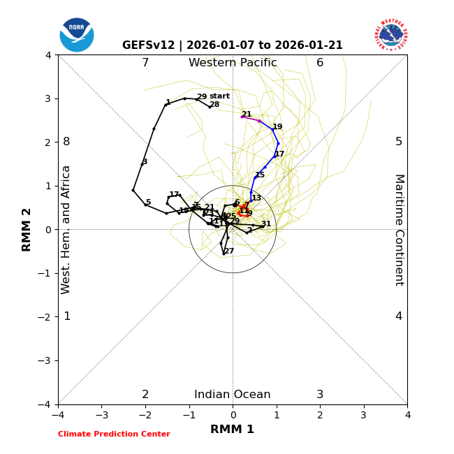 Today’s GEFS and EPS MJO forecasts both have a 2+ amplitude (strong) phase 6/7 starting in week 2: -GEFS has 2+ amp phase 6 for Jan 17-21 with a peak at ~2.6 on 1/21 (often strong GEFS forecasted MJOs verify a bit weaker in this region fwiw) -EPS has ~2+ amp phase 6-7 (mainly 7) for Jan 16-21 with a peak at ~2.2 in phase 7 on 1/19 (sometimes EPS forecasted MJOs verify a bit stronger in this region fwiw) - These tell me that the chance for Jan to end up with 20+ days on or inside circle are decreasing. - The frequency of MJO amps of 2+ in DJF has increased substantially on a multi-decadal basis (climate change suspected): # of days MJO 2+ amplitude per DJF 70s-80s: 11 90s-00s: 17.5 10s-20s: 23 So far, 2025-6 has had 4 days of 2+ amp (Dec 1-4) These Jans had a 2+ amp phase 6 or 7: -2024 -2021-18 -2016-3 -2011-8 -2006 -2004 -2002 -1997 -1993-2 -1990-89 -1986 -1979 -1976 Note how much less common 2+ amp periods were in Jan during 1975-2001 (only 30% of the Jans) vs 2002-2025 (67%)! —————— Here’s another MJO stat. tidbit: # of days per phase Jans 2011-25 (465 total days)/% of Jan days per phase 1: 17 (only 4%) 2: 26 (only 6%) 3: 67 (14%) 4: 51 (11%) 5: 57 (12%) 6: 101 (a whopping 22%) 7: 104 (a whopping 22%) 8: 42 (9%) So, since 2011, each of Jan phase 6 and 7 days has been more than twice as common as phase 8 days and a whopping FIVE times as frequent as Jan phase 1-2 days!