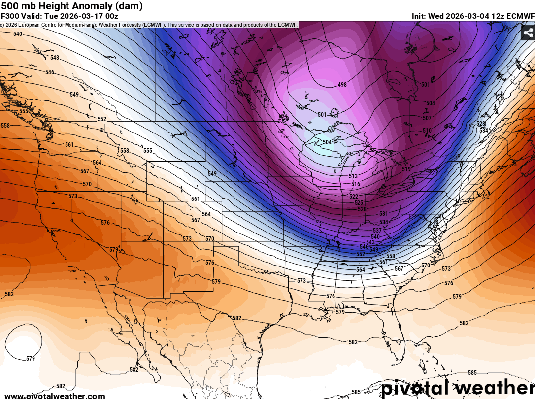 With the upcoming warmup, March is almost certainly going to end up above average in the Eastern 1/3 of the US. The only way we get a below average temperature departure is if we have something like this: 2011-03-23 40 32 36.0 -8.8 29 0 0.87 T 0 2011-03-24 44 30 37.0 -8.2 28 0 0.09 1.0 1 2011-03-25 42 28 35.0 -10.5 30 0 0.00 0.0 0 2011-03-26 40 26 33.0 -12.9 32 0 0.00 0.0 0 2011-03-27 45 28 36.5 -9.7 28 0 0.00 0.0 0 2011-03-28 45 26 35.5 -11.1 29 0 0.00 0.0 0 2011-03-29 49 31 40.0 -6.9 25 0 0.00 0.0 0 2011-03-30 53 36 44.5 -2.8 20 0 0.01 0.0 0 2011-03-31 43 37 40.0 -7.7 25 0 0.13 T 0 -