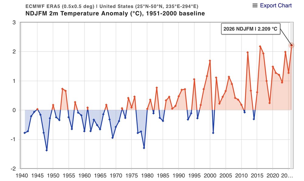 There are a few ways of looking at this. If you use a linear model, then you would be correct. But a non-linear process involving threshold temperarures of marine heatwaves potentially driving the forcing leading to that record breaking ridge would be a different case. The ridge out West was much stronger from November to March this year than the similar weak La Niña in 1995-1996. Such an increase could be the result SST forcing thresholds being met and the pattern becoming much more amplified and locking in over a longer duration. So rather than a gradual increase in temperatures and 500mb ridging, the warmer background pattern resulted in more of a jump. The CONUS was actually slightly colder in 1995-1996 instead of the warmest November to March on record in 2025-2026. So there wasn’t even the extended record warmth out West over the same period back in 1995-1996. https://agupubs.onlinelibrary.wiley.com/doi/full/10.1029/2022GL101499 Circus Tents, Convective Thresholds, and the Non-Linear Climate Response to Tropical SSTs Using model simulations, we demonstrate that the climate response to localized tropical sea surface temperature (SST) perturbations exhibits numerous non-linearities. Most pronounced is an asymmetry in the response to positive and negative SST perturbations. Additionally, we identify a “magnitude-dependence” of the response on the size of the SST perturbation. We then explain how these non-linearities arise as a robust consequence of convective quasi-equilibrium and weak (but non-zero) temperature gradients in the tropical free-troposphere, which we encapsulate in a “circus tent” model of the tropical atmosphere. These results demonstrate that the climate response to SST perturbations is fundamentally non-linear, and highlight potential deficiencies in work which has assumed linearity in the response.