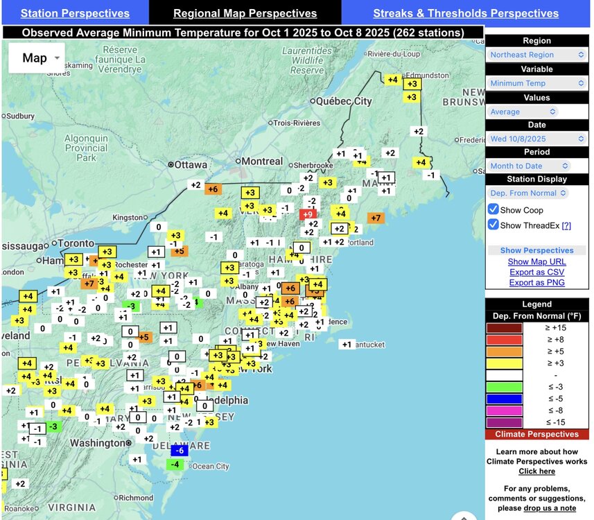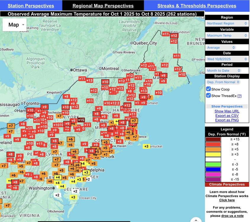 Pretty much the greatest divergence between the max and min departures for the first week of October that you will see. Saranac Lake may be the best example of this big spread. Record temperature rises and falls for early October within a few days. They were at a +9.4° max and a -2.9° min through yesterday. Climatological Data for Saranac Lake Area, NY (ThreadEx) - October 2025 Click column heading to sort ascending, click again to sort descending. Sum 617 293 - - 127 0 1.11 Average 68.6 32.6 50.6 3.2 - - - Normal 59.2 35.5 47.4 - 159 0 1.14 2025-10-01 59 26 42.5 -6.4 22 0 0.00 2025-10-02 64 23 43.5 -5.0 21 0 0.00 2025-10-03 72 29 50.5 2.4 14 0 0.00 2025-10-04 77 38 57.5 9.8 7 0 0.00 2025-10-05 82 42 62.0 14.6 3 0 0.00 2025-10-06 80 36 58.0 11.0 7 0 0.00 2025-10-07 75 42 58.5 11.9 6 0 1.08 2025-10-08 59 34 46.5 0.3 18 0 0.03 2025-10-09 49 23 36.0 -9.9 29 0 0.00 2025-10-10 M M M M M M M 2025-10-11 M M M M M M M 2025-10-12 M M M M M M M 2025-10-13 M M M M M M M 2025-10-14 M M M M M M M 2025-10-15 M M M M M M M 2025-10-16 M M M M M M M 2025-10-17 M M M M M M M 2025-10-18 M M M M M M M 2025-10-19 M M M M M M M 2025-10-20 M M M M M M M 2025-10-21 M M M M M M M 2025-10-22 M M M M M M M 2025-10-23 M M M M M M M 2025-10-24 M M M M M M M 2025-10-25 M M M M M M M 2025-10-26 M M M M M M M 2025-10-27 M M M M M M M 2025-10-28 M M M M M M M 2025-10-29 M M M M M M M 2025-10-30 M M M M M M M 2025-10-31 M M M M M M M