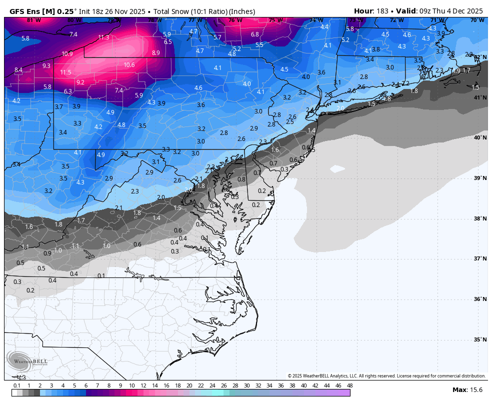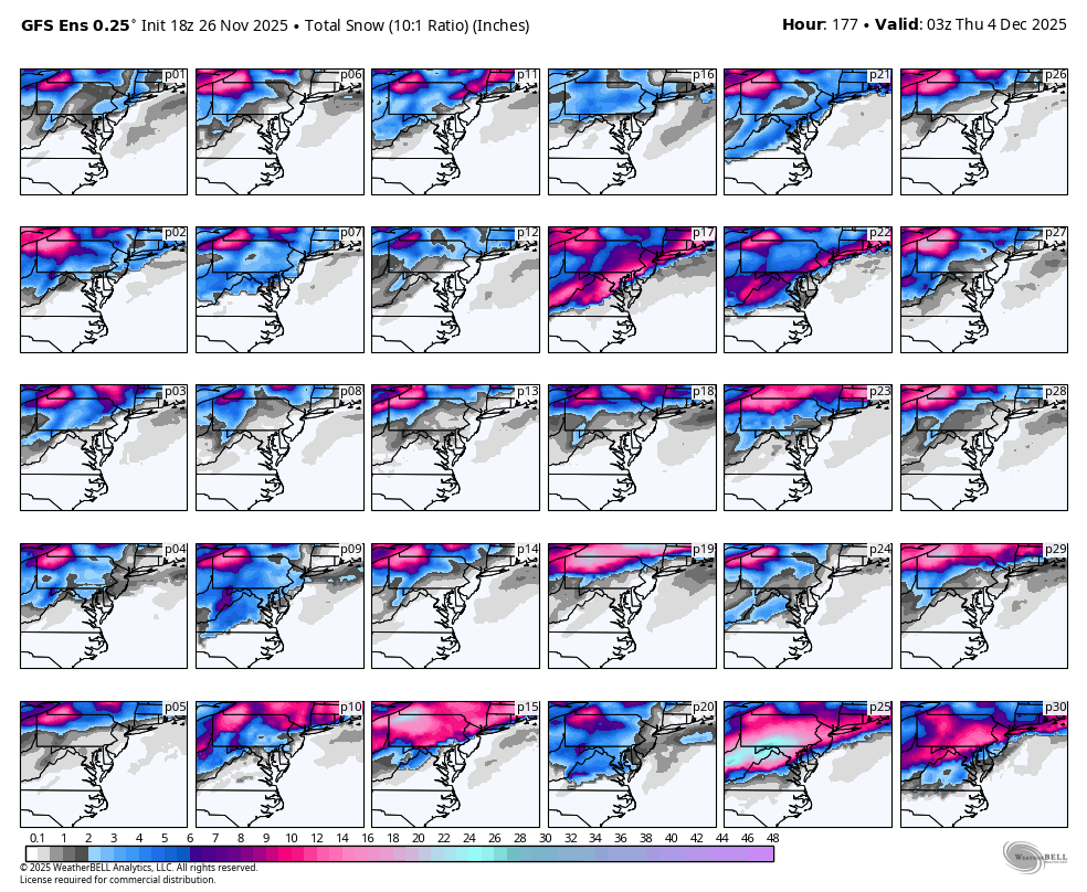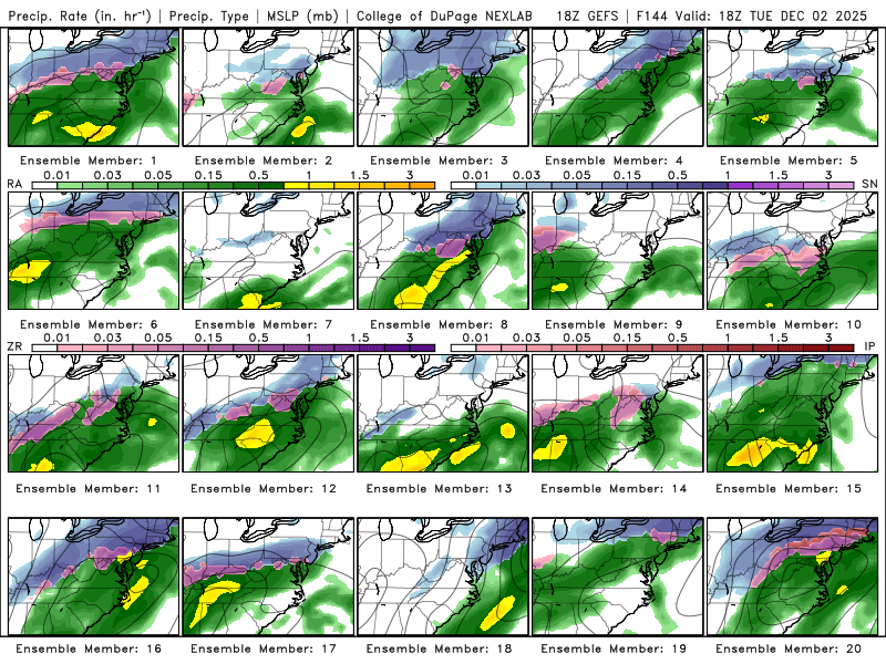 18z GEFS coming in with a pretty evenly distributed amount of members going for snow, too far north and rain, and too far south and miss. The track of this storm and its behavior is dependent on many factors, namely timing, track of the shortwave as it rounds the base of the TPV lobe, and how strong the TPV can actually suppress this thing south. It is certainly possible that the TPV suppresses this storm too far south which is what the Euro AI is showing. I think the GFS solution of a changeover to rain is unrealistic, and a much more likely fail mode is that the shortwave is too flat and goes out to sea. The 18z Euro should be in range tonight if not for the early morning 06z run, so we'll have more guidance to go off of for this 18z suite -
