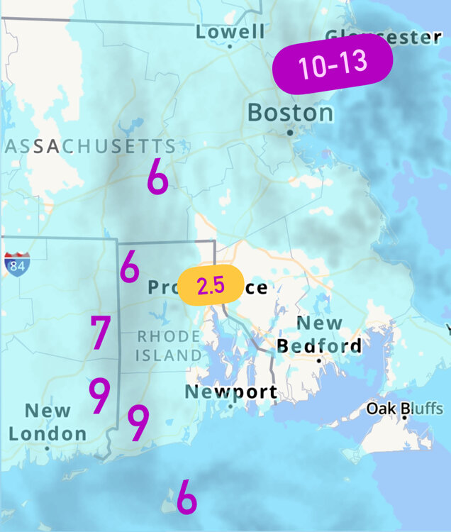 2.5” The Rest of RI : 6-9. North Shore (which ALREADY Jackpoted the big one last week And Jackpotted the 2014-2015 Winter), 10”-13”. A FOOT!? This Winter can go Suck Itself. -