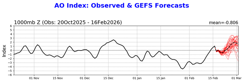 The latest AO forecast is even more aggressive with the development of an AO+: Given the other forecast teleconnections, this implies that the late February cold shot will likely be short-lived. Temperatures could return to near normal or above normal levels in the Great Lakes Region and Northeast in the closing days of the month. -