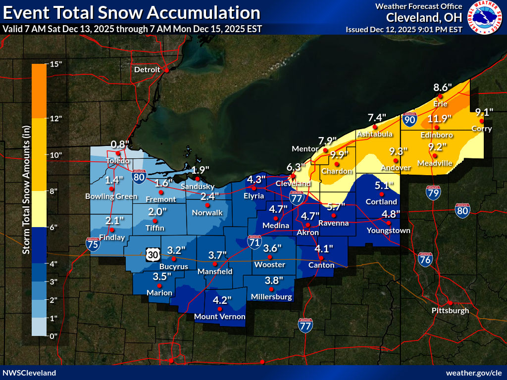 For verification purposes later, here was the snow map that fell out of my forecast this afternoon. If I were to say there are two areas I'm most concerned about, it's potential for a locally higher amount in the secondary snowbelt or western Cleveland metro area (i.e. western Cuyahoga or Lorain, Medina, Summit, Portage or Trumbull) if banding settles into those areas Saturday night or Sunday...and also potential for the eastern lakeshore to again come in lower than forecast if banding doesn't settle over that area late Saturday afternoon/evening.