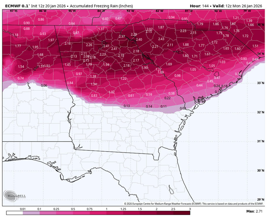 Euro is going to be a monster again. 1.25 to 2 inches of QPF from Southern Kentucky to the Northern Alabama/Georgia area.