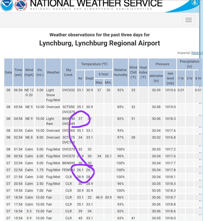 32 and snow here in Forest, maybe a half inch? Here was the temp spike in Lynchburg from the clouds..