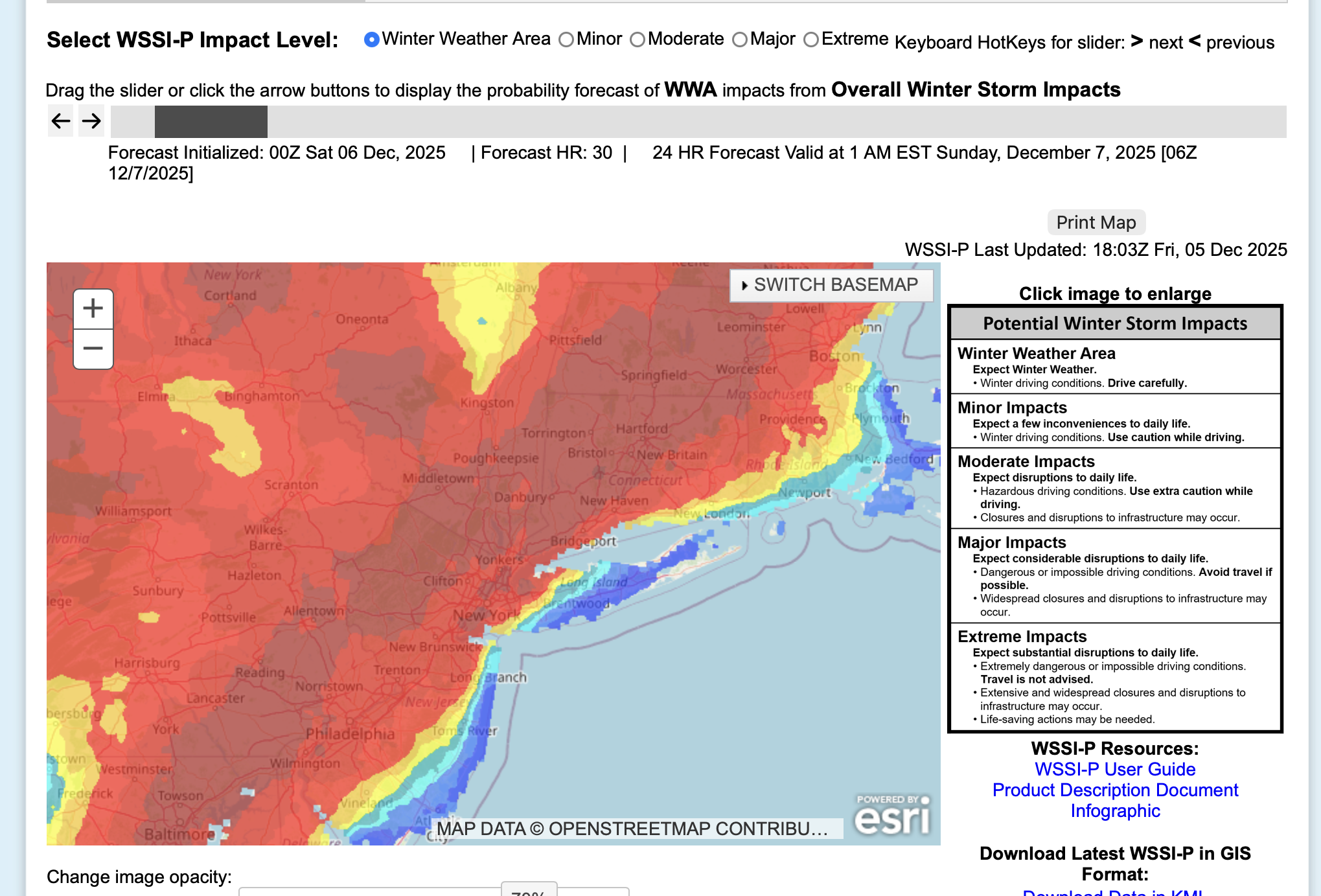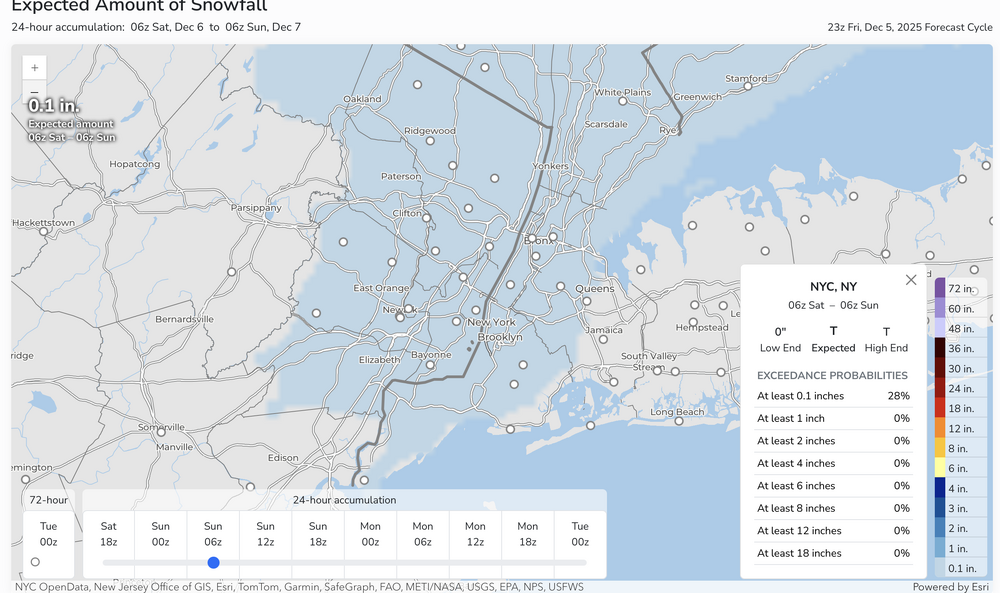 OKX issued an SPS for tomorrow morning covering parts of the area and multiple models but not all, have spotty very light freezing-frozen precipitation in our area over night. mPing may be helpful in addition to monitoring radar developments, especially 4A-9A Sat. Questions are: will the expected low top precipitation be heavy enough to measure 0.01 NYC metro and will temps remain at or below 32F in CP overnight. Couldn't wait much longer to decide. Graphics below: WSSI-P for winter drivIng habits overnight... ie not even MINOR impact according to the criteria, and the probabilstic snow portal for NYC CP. So odds are against but am not waiting this out. Probably no measurable snow NYC but someone in the I95 corridor of NJ-NYC-CT is going to get a little wintry weather overnight... more than the flurries of earlier today. 658P/5