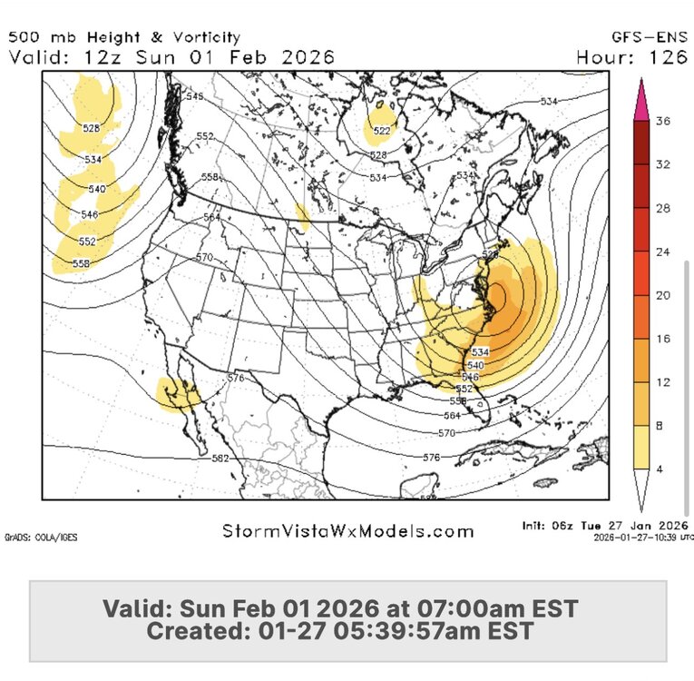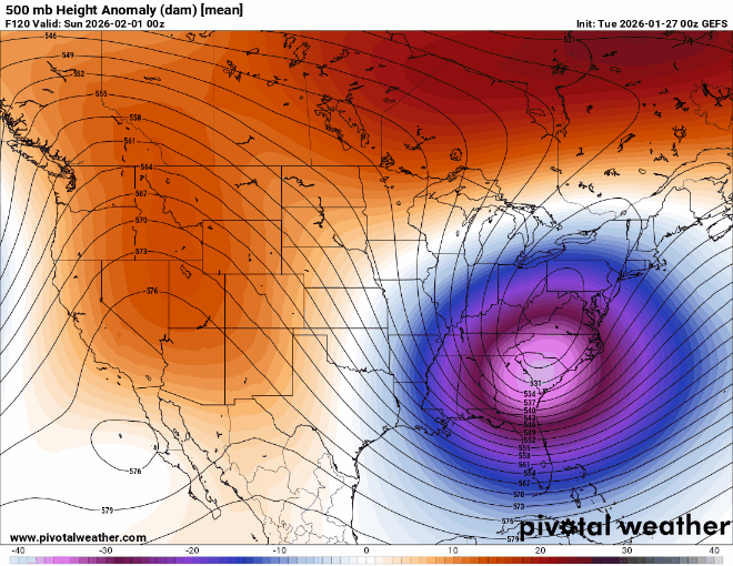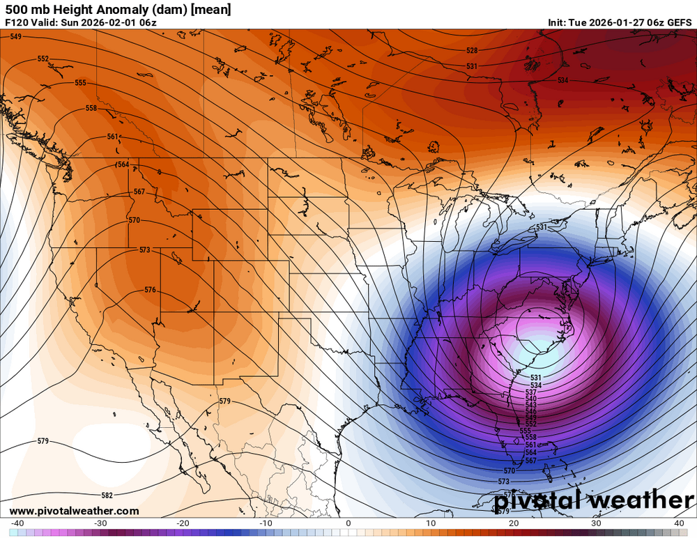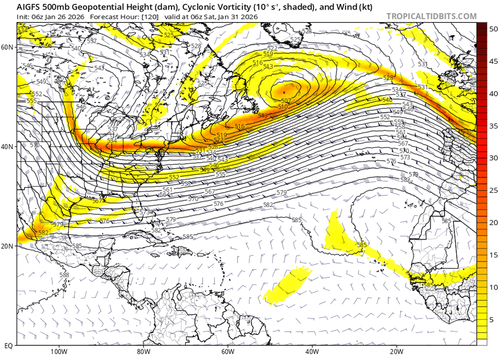 For those wanting to understand the synoptics of the pattern and why the GFS trended better, it's mainly related to the upper low over the northern Atlantic. In the older days, this feature was/is referred to as the New Foundland low or "50/50" low, which forms near the 50W/50N longitude. It's a prevalent feature during -AO patterns which features lower heights over the CONUS and northern Atlantic, while higher heights build into the northern latitudes. This upper low acts as a way to slow down the pattern and induce additional cutoff lows upstream (in this case it would be our storm). The problem is if it's too strong it will suppress or shear out any attempts at this feature. This is a common model fault especially during these types of extreme -AO patterns. It's also a reason why commonly see these sytems trend NW as we draw closer. We want to see this 50/50 low continue to trend quicker and exit faster into the Atlantic. This allows the heights over the east coast to rise and give us a better chance at a cutoff with at least a positive tilt, which will throw back Atlantic moisture. -