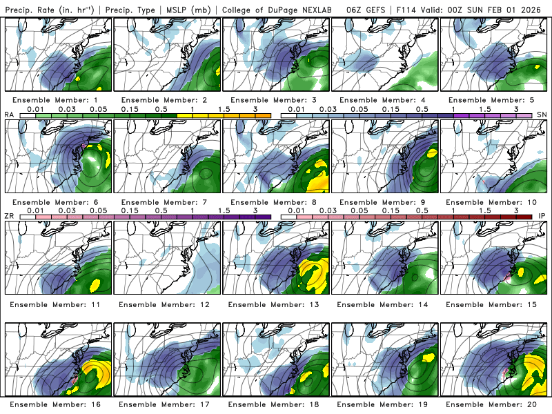 The clustering of sfc low positions gives better info than median, while median is better for looking at scalar variables like temps/QPF/snowfall amounts. You can see lots of western clustering to the left of the mean low
