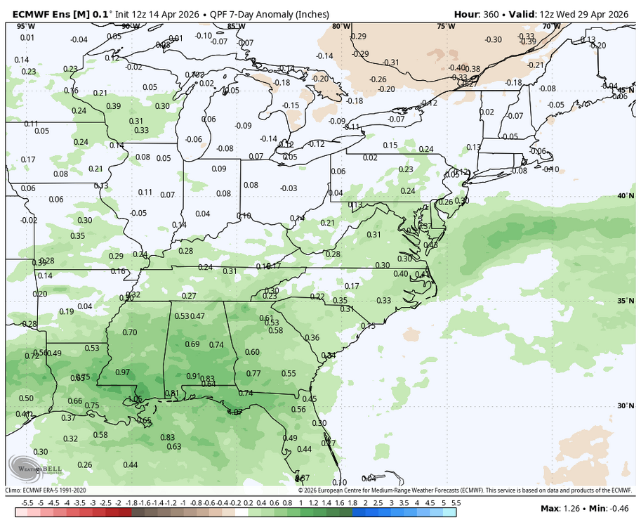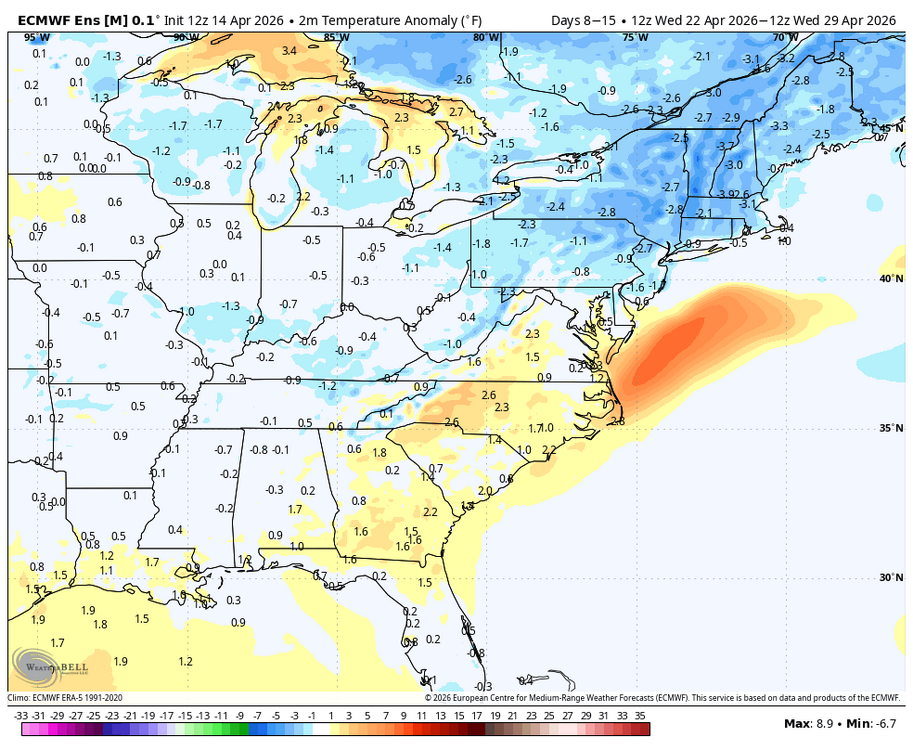 An early summer preview is getting underway... Tomorrow through Thursday will feature exceptional early season warmth. Temperatures will likely peak in the 80s on all three days in most of the region. Records could be challenged on Wednesday. Some of the guidance suggests that the hot spots could approach or reach 90° during the height of the warmth. Long Island will be cooler with highs peaking in the 70s due to onshore breezes. However, there is a chance that Islip could approach or reach 80° on Wednesday. Following the bout of early season heat, readings will return to the 70s to end the week and start the weekend. Dry conditions will also persist. No rain is likely through at least Friday. The ENSO Region 1+2 anomaly was +1.5°C and the Region 3.4 anomaly was +0.2°C for the week centered around April 8. For the past six weeks, the ENSO Region 1+2 anomaly has averaged +1.30°C and the ENSO Region 3.4 anomaly has averaged +0.07°C. Neutral ENSO conditions will continue through at least mid-spring. The SOI was -15.22 today. The preliminary Arctic Oscillation (AO) was -0.659 today. Based on sensitivity analysis applied to the latest guidance, there is an implied near 84% probability that New York City will have a warmer than normal April (1991-2020 normal). April will likely finish with a mean temperature near 56.8° (3.1° above normal). Supplemental Information: The projected mean would be 3.8° above the 1981-2010 normal monthly value.