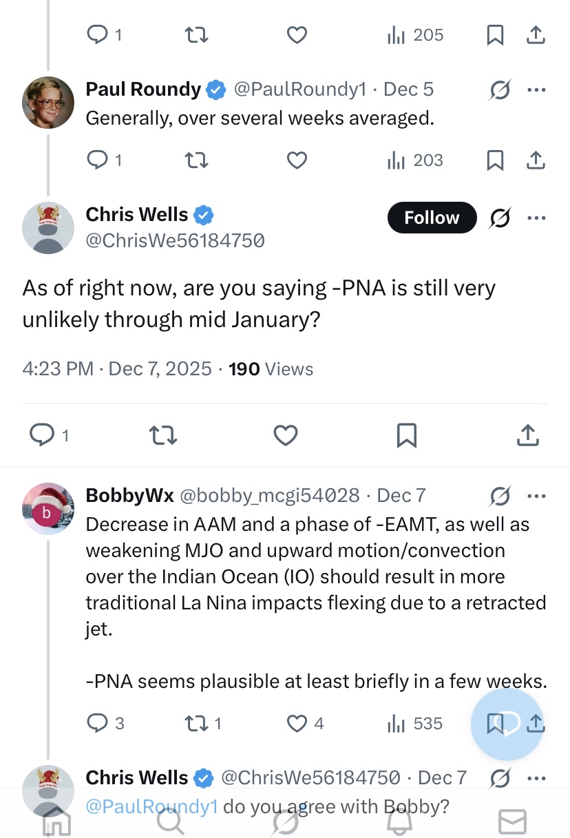 I've bumped this post, because the original embedded tweets calling for a PNA+ in December were deleted (not by @stadiumwave). It's ok to be wrong in a field where there are no crystal balls and variables typically have low coefficients of determination. These low coefficients of determination increase complexity and raise risks of oversimplification. Error is inescapable. It's also ok to change one's thinking. Indeed, the information on how one's thinking evolves can provide insight and also learning opportunities. IMO, it's not ok to simply delete posts to obscure one's errors. Indeed, it is bad practice. That someone I greatly respect makes this bad practice all the more disappointing. Although the original post is gone, at least some people remember that the prediction made (and one I questioned here) was for a predominantly positive PNA in December. The argument was that the base state did not favor a PNA-. Probably not too surprisingly, the poster's question was ignored. Responding to it would have acknowledged the original position that apparently was deleted. -