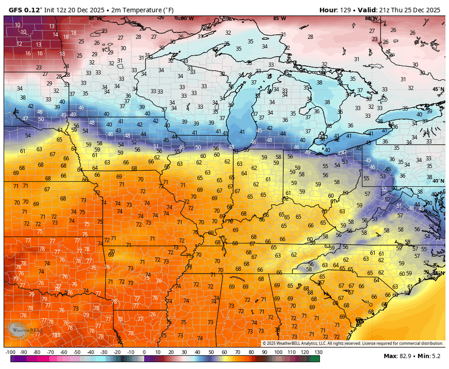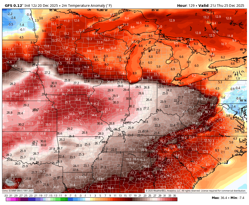 Maybe in western PA, cool air has a good chance of holding in the rest of the state east of the Alleghenies Christmas Day. GFS a bit cooler than the Euro (actually slightly below average in eastern PA), but even the Euro only has MDT getting into the low 40s or so. Even if it did bust 50 degrees the +5 to 10 departure that would make high-wise is pretty tame compared to where the real torch is centered. + Anomalies Christmas Day in the central plains are bananas, in the realm of 30-40 degrees above average. We may have a couple fairly warm days on or just after Christmas, but the -NAO blocking is likely going to keep us from being overrun with any kind of warmth like that. 12z GFS temps/anomalies -