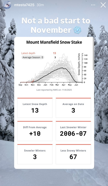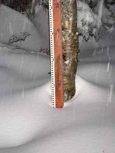 The clipper system affecting the area yesterday into today dropped another round of snow in the mountains and we even saw snow transiently accumulating in some of the lower valleys. This system was similar to the last one that affected the area on Friday into Saturday, but temperatures seemed to be a bit colder on the back side this time around. This morning when I checked the view on Bolton Valley’s Base Lodge Webcam, the accumulations appeared to be a bit more robust than last time around. Seeing hat, I knew there would be plenty of snow for using skins right from he base, so I geared up for a ski tour and headed up to the mountain. While the snow line was still fairly high with this system, the local ~2,000’ peaks around us in the Winooski Valley were coated with white for their top ~300’ of vertical, so that suggested that the snow level had dipped just a bit lower than what we’d seen over the weekend. Heading up the Bolton Valley Access Road, I saw the first traces of snow around 1,200’ just like Saturday, but Timberline showed a decent covering down to its 1,500’ base, and up in the Village at 2,000’ I found 3-6” of snow, which was more than what had accumulated Saturday morning. Temperatures were cooler today than they were on Saturday, and even at 2,000’ the temperatures were easily below freezing. The cooler temperatures meant that the powder was of much higher quality than what’s we’d seen over the weekend, and with some base snow already in place, the quality of the powder skiing took a big leap forward from where it had been. Compared to what was available on Saturday, today was simply easy breezy midwinter-style powder skiing. All you had to do was lean in and carve. When checking snow depths today, I couldn’t really differentiate the new snow from the old snow that was already present from the last system, but the updated elevation-based snow profile is below. In the list, the first depth values are what I found on Saturday, and the second depth values are what I observed today. Nov 1 --> Nov 6 1,000’: 0” --> 0” 1,200: T” --> T 1,500’: T-1” --> 1” 2,000’: 1-4” --> 3-6” 2,500’: 4-6” --> 5-9” 2,800’: 7-11” --> 9-12” 3,150’: 7-11” --> 10-16” With every one of these storms that passes through and drops snow, the potential increases for this to be the start of the winter snowpack. With typical November temperatures, I wouldn’t expect the higher elevation snow to melt too quickly, so we’ll just have to see if there are any warm spells or big rainy systems in the future that might be able to put a dent in the snowpack.