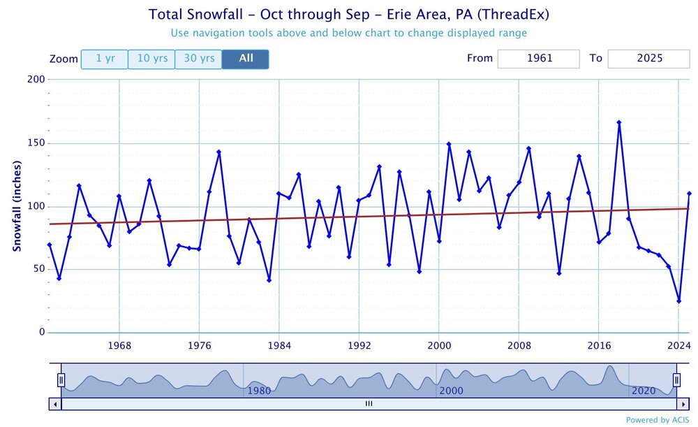 The snowbelt areas to the east of Cleveland have been holding their own with the shift in the storm tracks. Places like Erie, PA are positioned better for all the storm tracks through the Great Lakes. It’s areas to the east like State College that are on the warmer side of the storm tracks now which have seen a steep decline.
