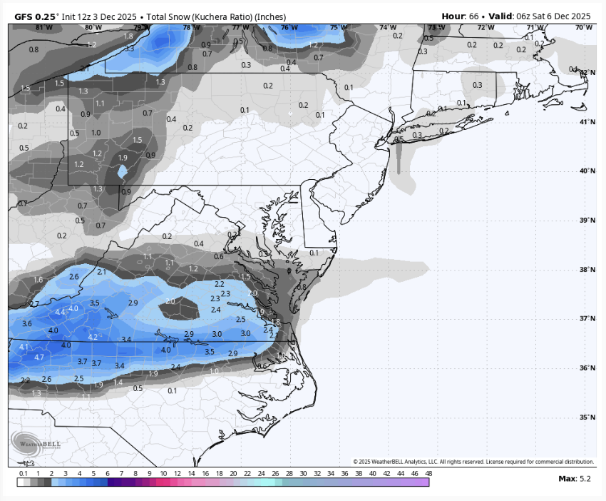 0z ECM gets about 1" of snow up to NYC on Friday evening. It looks cold enough to accumulate most areas if snow does make it that far north. Not much support at this point, however. The ECM is the northern outlier.