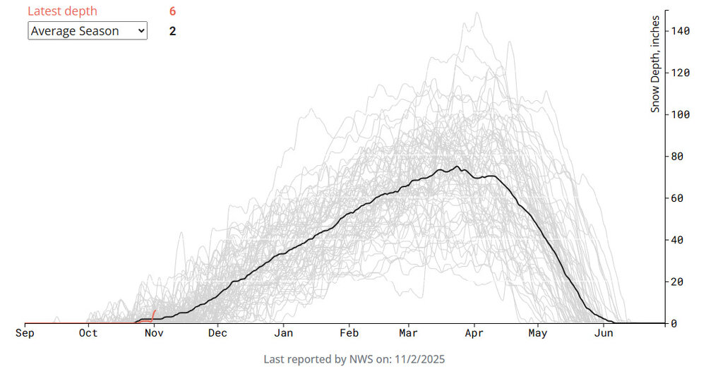 It certainly wasn’t our deepest early season dump by any means, but the snow is reasonably dense as you mentioned, and thus far it’s had plenty of staying power. I was watching The Weather Channel this morning, and they had the Sugarbush Gate House Plaza View Webcam playing on the side of the screen during one of their segments as they often do – I was surprised to see how low the snow line was on Spring Fling. Since the base area there is just a bit below 1,500’, that snow on Spring Fling looks like it’s persisting below 2,000’, and it’s obviously even more substantial higher up as the still image below shows. A quick run through the GFS shows a pattern that looks pretty similar to what it was depicting a few days ago, with approximately 6 storms in the queue out through roughly the 19th of the month. They would all have some snow potential to varying degrees. This morning on TWC, Jim Cantore walked through the modeling for the next week in our area and talked about the systems. That Friday/Saturday system looks like it’s the warmest, with the least snow potential, but the BTV NWS is talking about the general pattern in their discussion – you can tell they see the queue of potential storms as well with the wording ”No less than 3 discrete systems are on track to cross the region during the period…”: Area Forecast Discussion National Weather Service Burlington VT 147 PM EST Mon Nov 3 2025 LONG TERM /THURSDAY THROUGH MONDAY/... As of 138 PM EST Monday...As mentioned last night, our area remains in an active weather pattern in the late week time frame as the mean core of the northern stream westerlies continue their seasonal migration southward into the northern tier of the country. No less than 3 discrete systems are on track to cross the region during the period, the first coming Wed/Wed night, with the others swinging through Friday/Friday night and again by next Sunday/Sunday night. The general idea is to run with higher, 60-90% precipitation probabilities with each system, the dominant p-type falling largely as rain in the lower elevations. A mix of rains/wet snows at elevation is more likely on the back side of these features, especially Wednesday night and potentially by next Sunday night as deeper meridional troughing digs across the eastern third of the CONUS. Temperatures to remain seasonably cool through the period, with diurnal variation somewhat tempered by an abundance of typical November cloud cover. Now that we’re into November, we’re hitting the point where “seasonable” means snow, so all these systems should be of potential interest. With the recent snowfall persisting at various elevations, the active pattern, and no huge systems expected to go barreling up through the Great Lakes to our west, it got me wondering about the start of the winter snowpack. I knew we were a bit on the early side to start the snowpack, so I went to the data to see what the actual numbers said. With the available data from 68 seasons, the mean start date for the Mt. Mansfield snowpack is 11/16, with the median date at 11/15, the mode at 11/18, and the S.D. at 14.5 days. So if the snows from Oct 31/Nov 1 were to persist, it wouldn’t be all that unusual. The snowpack should start by November 1st in about 15% of seasons. I was surprised to find that the snowpack actually starts in October in roughly 13% of seasons. It’s also interesting to note that the past three seasons have helped push the median start date for the start of the continuous snowpack on Mt. Mansfield forward in time. The past three seasons have had very respectable start dates for the Mansfield snowpack (11/14/22, 10/30/23, and 11/12/24), which represent start dates of 2, 17, and 4 days ahead of the mean, respectively. Obviously the 10/30/23 start date was the heavy hitter here with respect to any movement in the mean. The addition of those dates didn’t budge the mean start date from where it was at 11/16, but they did move the median from 11/16 up a day to 11/15. It’s far from a “lock” that the recent snow we’ve had would be the start of the snowpack for the season (who knows what will happen with these upcoming storms, and what will go on in later November and December), but the current situation is such that it will be interesting to watch and see how it plays out. I guess I hadn’t noticed it before, but when averaged out as shown by the black line in Matt Parrilla’s plot below, the “average” snowpack start is back in mid to late October. Those data average out all the starts and stops that the snowpack has in a real year though, so that’s where you get the difference in that ~10/22 snowpack start vs. the actual 11/16 mean for the start of the continuous snowpack.