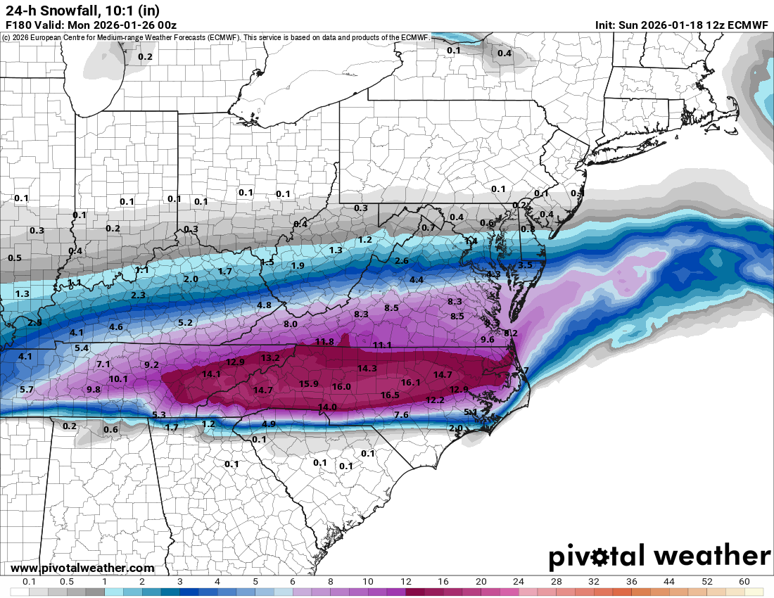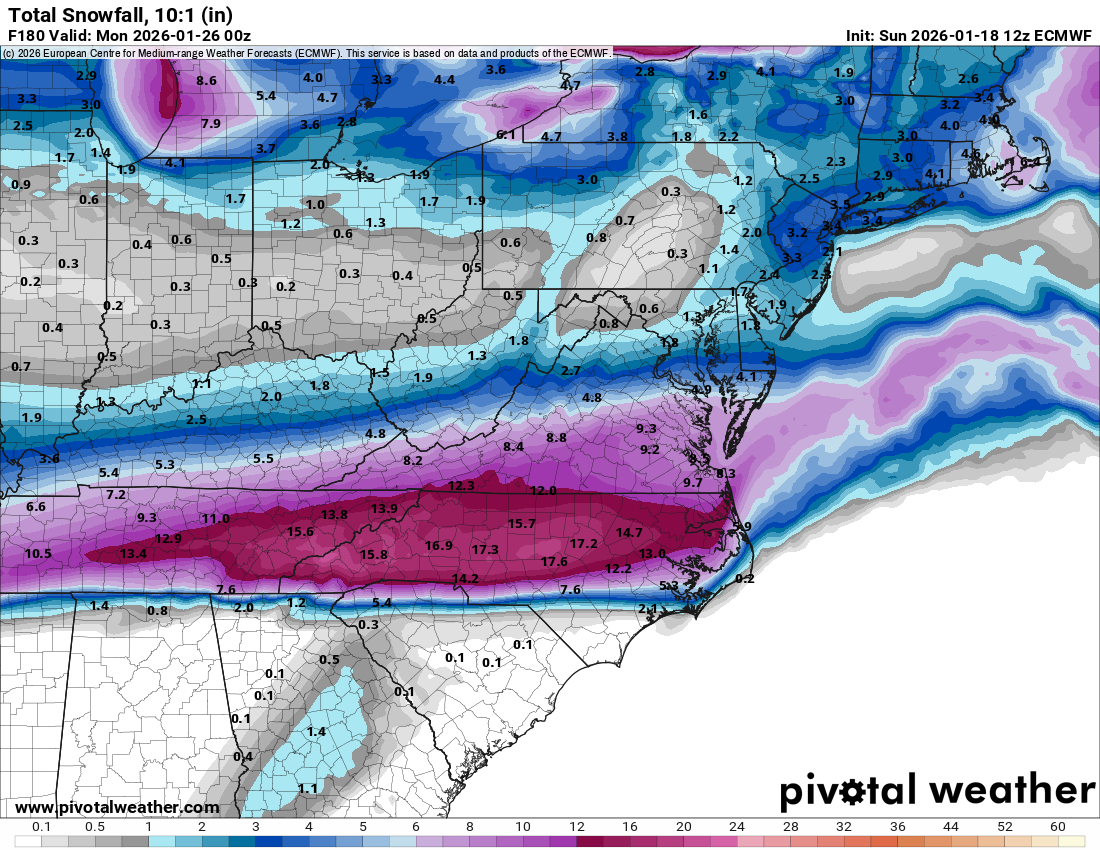 Oy, Gevalt, yes please! But seriously...ignoring the specific amounts, the ensembles (mean at least) clearly has the main swath of snow (and precip) through the area here. Going with just that, it's clear the deterministic GFS is currently outside the main envelope here with giving GA/SC/NC the heaviest snow and/or ice. -