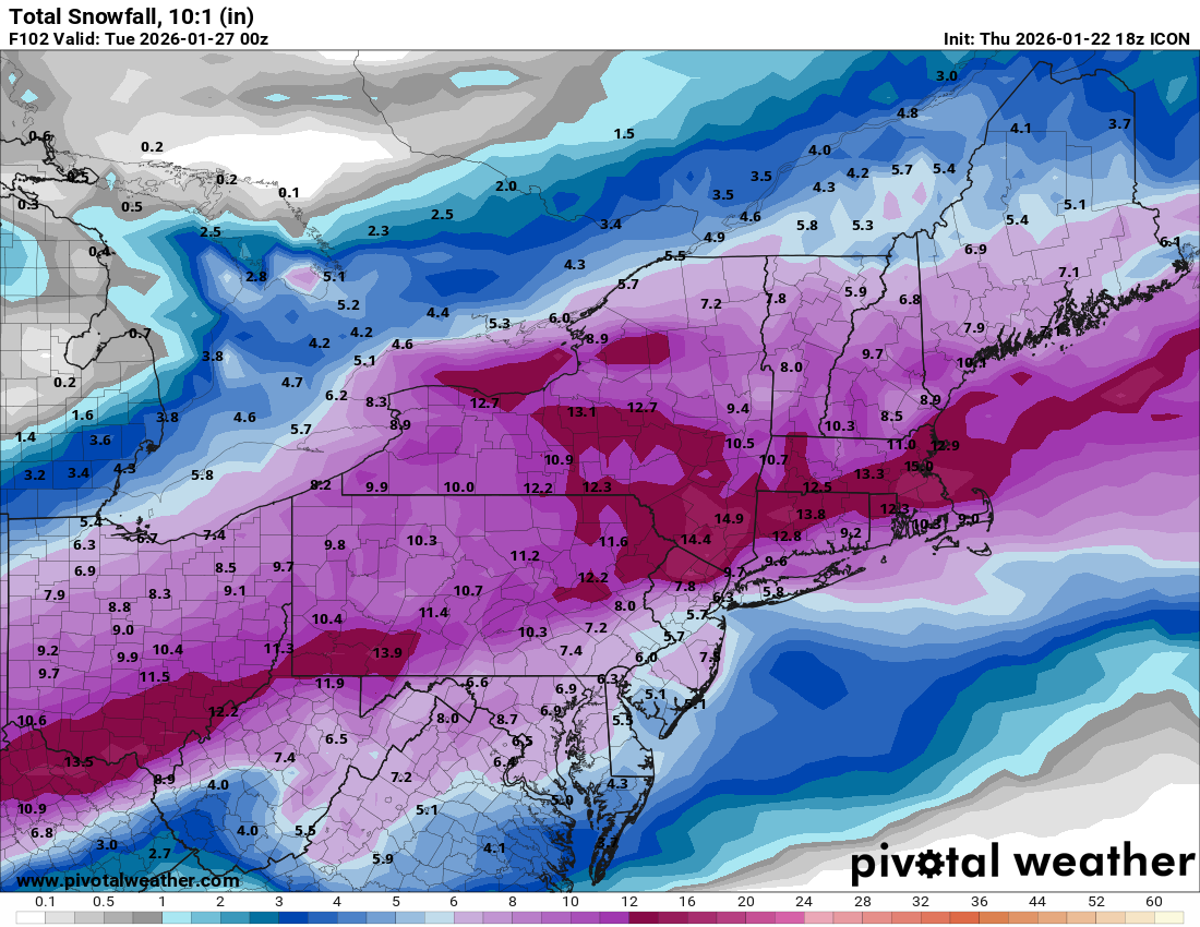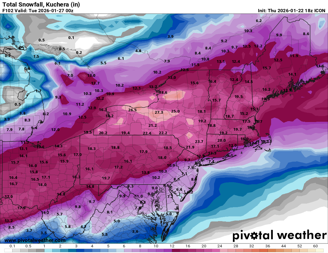 Arctic air is poised to return to the area tomorrow. A frigid weekend lies ahead. That will set the stage for the region's biggest snowstorm so far this winter and perhaps in a number of years. The temperature will likely stay below 20° in New York City and much of the region on Saturday. The last time that happened in New York City was January 21, 2025 when the high was 19°. Snow could arrive on Sunday. A significant snowfall is likely in and around the New York City area and surrounding region, even as a transition to sleet is likely. At present, it appears that New York City and its nearby suburbs are in line for 6"-12" of snow. Higher amounts are likely north and west of the City where ratios will be higher and mixing is less likely. There could be a few pockets of 12"-18" amounts in that region. Lesser amounts, probably in the 4"-8" range appear likely along the central Jersey Shore and across parts of Long Island. The last time New York City saw a 6" or greater snowfall was January 28-29, 2022 when 8.3" fell. Its last 10" or above snowfall occurred during January 31-February 3, 2021 when 17.4" accumulated. There remains uncertainty and it may still be another day or two before the details can be pinned down with high confidence. Very cold air will return to the region as the storm departs. Highs will be in the 20s through at least midweek. Overall, January 20th-February 3rd will likely be the coldest and perhaps snowiest two-week period this winter. The forecast WPO-/EPO-/AO-/PNA+ pattern is typically the coldest pattern in January and among the coldest during the first half of February. A persistently positive PNA will have above climatological risk of moderate or significant snowfalls. For perspective, the coldest two-week period this winter prior to January 20th was January 3-16, 2026 and January 4-17, 2026 with a mean temperature of 30.3°. The snowiest two-week period was December 14-27, 2025 when 7.2" of snow fell. The ENSO Region 1+2 anomaly was -0.3°C and the Region 3.4 anomaly was -0.7°C for the week centered around January 14. For the past six weeks, the ENSO Region 1+2 anomaly has averaged -0.48°C and the ENSO Region 3.4 anomaly has averaged -0.68°C. La Niña conditions will likely continue into at least late winter. The SOI was -4.52 today. The preliminary Arctic Oscillation (AO) was -2.162 today. Based on sensitivity analysis applied to the latest guidance, there is an implied near 98% probability that New York City will have a cooler than normal January (1991-2020 normal). January will likely finish with a mean temperature near 30.6° (3.1° below normal). Supplemental Information: The projected mean would be 2.0° below the 1981-2010 normal monthly value.