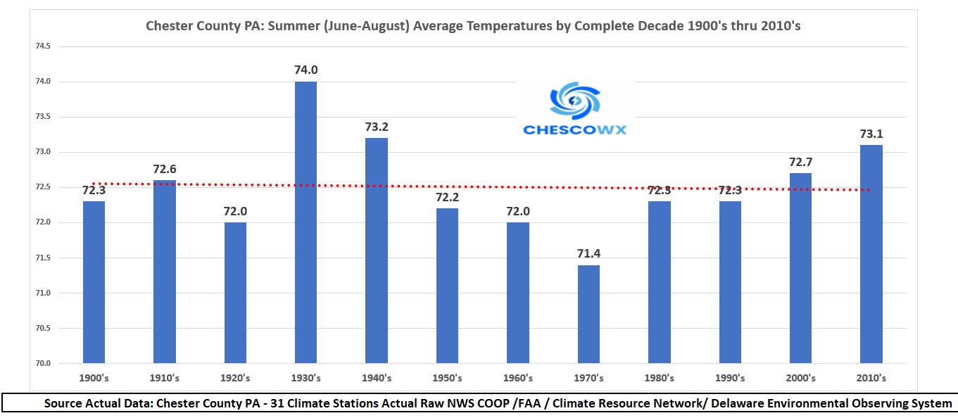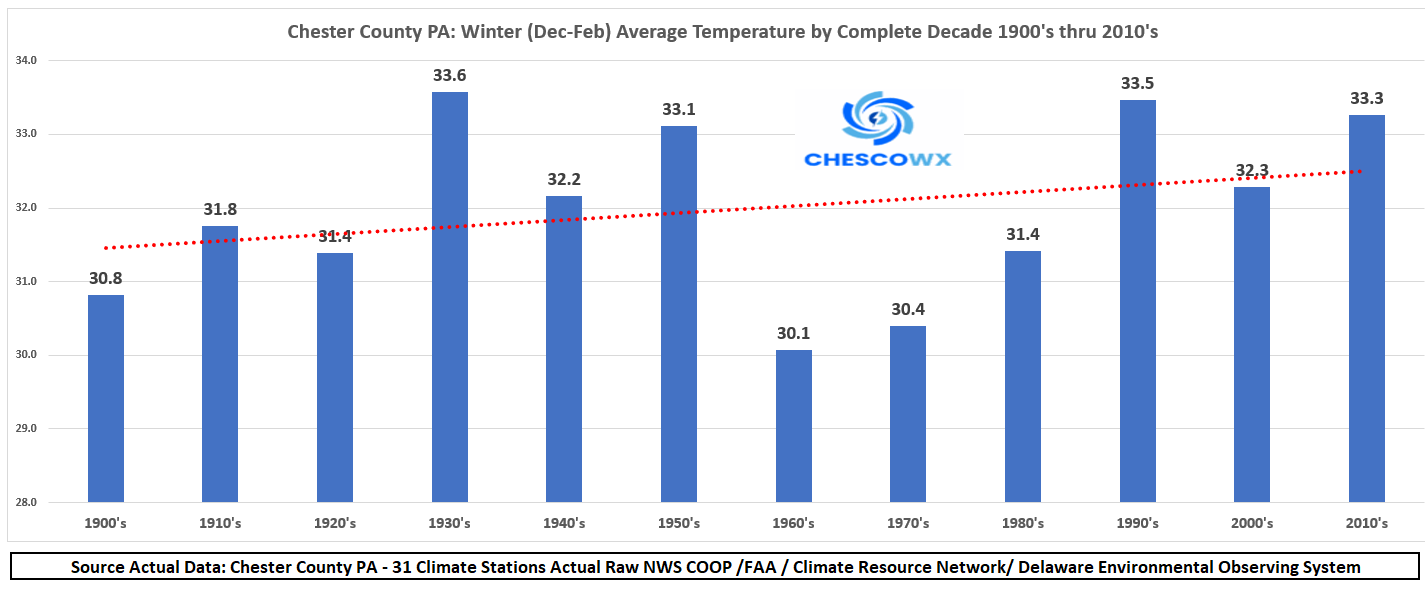 Some folks had asked me to perform an analysis of both the Winter and Summer Average Temperature by Complete Decades for just here in Chester County from the 1900's thru the 2010's. You will see the very cyclical nature of our warming and cooling patterns. Overall, we have seen some slight warming of winters and conversely some cooling of our summers across Chester County PA. The warmest decade for both summers and winters was way back in the 1930's. Of note so far here in the partial decade of the 2020's we are so far running as the warmest winter decade since the 1930's!! However, last winter was the coldest winter in 10 years and we are off to a colder than normal start to this winter so we will wait and see if this is the start of the next cooling trend across the County. These are also updated on the http://www.chescowx.com website. Let me know if you have any questions. -