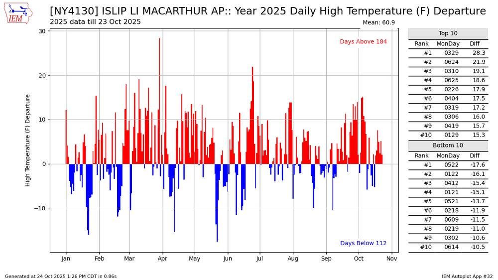 If we could find a way to replicate the cooler high temperature patterns that we have been getting in May recently at other times of the year, then we would be onto something. Islip , NYPeriod of record: 1963-09-05 through 2025-10-23DateLowest maximum temperatures (degrees F)Top Record 2nd Record 3rd Record 5/1 49 in 2016 52 in 1978 53 in 2019 5/2 51 in 1995 53 in 1988 53 in 1975 5/3 49 in 1985 53 in 2016 53 in 1986 5/4 47 in 1987 51 in 2016 54 in 1978+ 5/5 44 in 1978 46 in 1987 53 in 2016 5/6 50 in 1978 52 in 2016 52 in 1967 5/7 44 in 1967 50 in 2022 52 in 1965 5/8 53 in 1971 54 in 1992 54 in 1989+ 5/9 49 in 2020 49 in 1972 50 in 1977 5/10 52 in 1989 54 in 2024 55 in 1995+ 5/11 54 in 1998 54 in 1989 55 in 1995+ 5/12 48 in 2010 51 in 2008 55 in 1966 5/13 51 in 2019 51 in 2017 51 in 2002 5/14 52 in 2019 57 in 2006 57 in 1984+ 5/15 53 in 1978 55 in 1973 56 in 1967 5/16 53 in 1984 53 in 1978 54 in 1996 5/17 56 in 1978 57 in 1994 58 in 1966 5/18 49 in 2007 53 in 2002 56 in 1968 5/19 51 in 1976 53 in 1994 55 in 1993 5/20 51 in 2000 54 in 2005 55 in 2008+ 5/21 49 in 1990 54 in 2000 56 in 2025 5/22 53 in 2025 54 in 2003 57 in 2000 5/23 54 in 2003 54 in 1982 57 in 1973 5/24 56 in 1982 57 in 2003 57 in 1969 5/25 49 in 1967 51 in 2013 51 in 2005 5/26 52 in 1967 53 in 2003 57 in 1973 5/27 56 in 1974 57 in 1973 58 in 1983+ 5/28 60 in 2014 60 in 2009 60 in 1996+ 5/29 51 in 2021 58 in 2017 60 in 1996+ 5/30 52 in 2021 60 in 2017 61 in 1965 5/31 55 in 1984 61 in 1967 63 in 1992