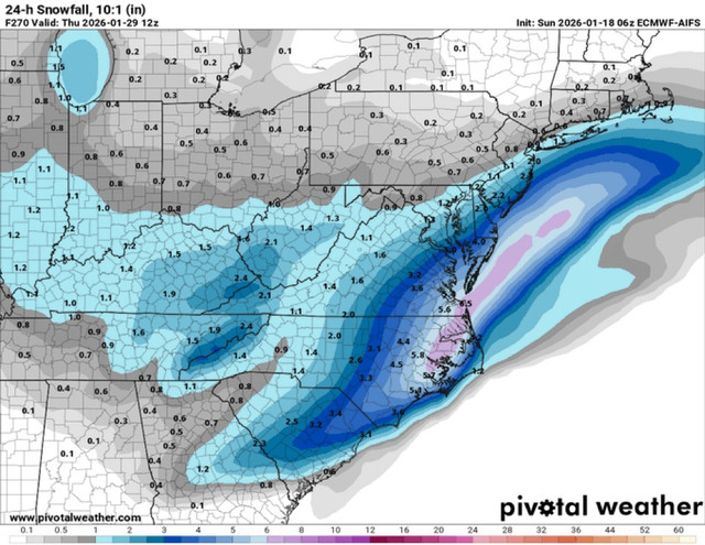 The Euro AIFS ensemble's control was a real weenie run at 6z: That said, I'm not sure how the AIFS ensemble is doing. I've seen people say it counts sleet as snow, and it overdoes the sorts of maps above. -