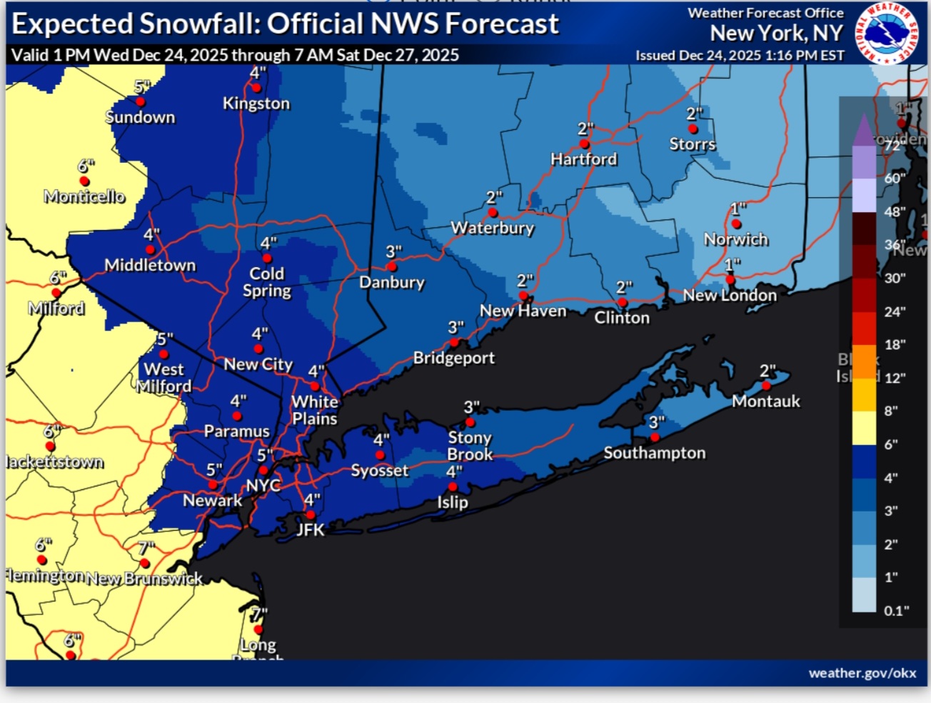 Michael- Right now, the highest confidence for a warning level snowfall is across the western portions of our forecast area. (west of eastern Long Island). We will continue to monitor data over the next 12-24 hours and see if adjustments to the forecast needs to change. But right now, the best chance for 6+ inches appears to be west of eastern Long Island