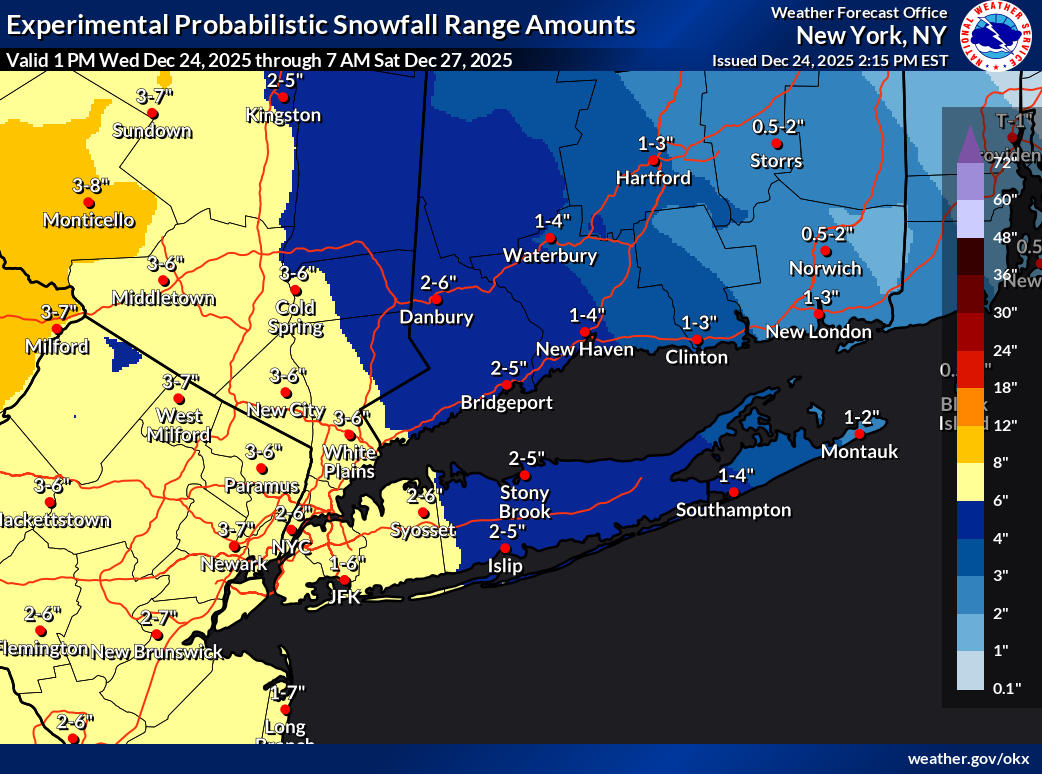 .SHORT TERM /THURSDAY NIGHT THROUGH SATURDAY NIGHT/... -- Changed Discussion -- What`s Changed: A winter storm watch has been issued for the Lower Hudson Valley, Northeast New Jersey, NYC metro, Nassau, Western Suffolk, and Fairfield County 5pm Friday through 1 pm Saturday. Key Messages: * Confidence in a winter storm impacting the area Friday evening through Saturday morning continues to increase. * Heavy snow is possible Friday night/early Saturday morning. Total accumulation ranges from 4 to 8 inches in the watch area and 2 to 5 inches east of the watch in SE CT and east end of Long Island. Guidance continues to come into agreement on a winter storm moving across the region Friday evening into Saturday morning. A fast moving shortwave and associated middle level energy will traverse around the periphery of an anomalously strong upper ridge over the central states. Ahead of the system, arctic air will advect southward over the northeast Thursday night as high pressure settles over Quebec and ridges down into the area. This high slows down due to blocking over the North Atlantic, which allows the cold air to lock into place over the area through Saturday. Low pressure associated with the aforementioned shortwave energy will approach late Friday and pass across the Middle Atlantic Friday night into Saturday morning. The low should then move further offshore Saturday afternoon. With arctic air in place on Friday (highs in the upper 20s to around 30, and dew points in the single digits), any precip will have a difficult time reaching the ground. This is especially through the middle of the afternoon. Lift ahead of the system begins to increase and saturation will begin from the mid and upper levels and eventually down to the surface by evening. Snow should begin to reach the surface late afternoon and especially in the evening from around the NYC metro on north and west. Further east, it may take a bit more time to saturate and break through the dry air and surface ridging, with accumulating snow likely here overnight Friday into early Saturday morning. Snow, potentially heavy at times, is expected Friday night. Where uncertainty lies is where any heavier bands will set up. We are still just outside the range of the higher resolution modeling. However, there are signals in the global models that hint that heavy banding may set up over portions of the area, especially within the watch. There is an impressive thermal gradient with the arctic air over New England, with milder air further south and west over the Ohio Valley. Mid level frontogenesis (H7) will increase substantially Friday evening and continue through early Saturday morning. The region also lies within the left exit region of the upper jet allowing for larger scale lift to coincide with the middle level lift. Lift should begin to weaken Saturday morning, but there may be some left over light snow across some parts of the area in the morning before ending midday. The region of the strongest lower/middle lift remains in question and may fluctuate a bit over the next several model cycles, but overall the general idea does not change with this upcoming event. Probabilities have increased for a warning level (6" or more of snow) with the latest with the latest WPC WWD and NBM. This has led to an increase in the areal coverage of higher probabilities (around 50%) in the WPC WSO. Based on these trends as well as increasing confidence in evolution of the system, have issued a winter storm watch for all but the east end of Long Island and south central and eastern Long Island. Confidence lowers a bit across Long Island and southern Connecticut, but felt western Suffolk and Fairfield were close enough to warning criteria to include in a watch. There is greater uncertainty further east due to the interaction with the lingering surface ridging/dry air and overall lower liquid equivalents. Snowfall Forecast: 4 to 8 inches possible within the watch area and 2 to 5 inches further east outside of the watch. A reasonable worst case scenario of 8 to 10 inches currents exists within the watch area with potential locations further east could still see warning criteria met. Snowfall rates: Peak rates around 1 inch per hour possible. There is a low chance rates could come close to 2 inches per hour in heavier banding. The snow may initially begin with a higher ratio (drier snow) and then trend to a lower ratio (wetter) as the storm moves across the area. This will be fine tuned over the next day or so as high range guidance comes into range and the event draws closer. There is still some concern with the warm advection aloft Friday night bringing in a mix with sleet late in the event. Some earlier model runs were showing this potential. The latest NBM probability of sleet is very low and trends seem to be leaning towards keeping the precipitation all snow across the area. Models can sometimes underestimate the warm advection aloft. This is something that will need to be watched, especially for parts of northeast NJ and interior Lower Hudson Valley as this is the direction the warm air aloft tries to move in from the west. There are no wind concerns with this event as the pressure gradient is relatively weak. Temperatures Thursday night will bottom out in the teens to lower 20s. Highs on Friday will only be in the upper 20s to around 30. Temperatures during the snow Friday night should be in the mid to upper 20s with highs on Saturday struggling to rise above freezing -- End Changed Discussion --