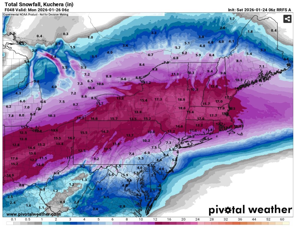 Latest Winter Storm updates just issued from NWS. URGENT - WINTER WEATHER MESSAGE National Weather Service Baltimore MD/Washington DC 526 AM EST Sat Jan 24 2026 ...MAJOR WINTER STORM WILL IMPACT THE REGION THIS EVENING THROUGH SUNDAY EVENING... .A large area of precipitation will overrun Arctic air in place over the Mid-Atlantic. This will lead to widespread significant snow beginning this evening, with the potential for ice Sunday especially south of Highway 50 and near and east of Interstate 95. In addition to the high threat for significant snow and ice, very cold temperatures are expected tonight through the middle of next week with sub-zero wind chills likely at times. MDZ003>005-502-VAZ028-030-031-040-501-505-WVZ050>053-504-241830- /O.CON.KLWX.WS.W.0001.260125T0400Z-260126T0900Z/ Washington-Frederick MD-Carroll-Central and Eastern Allegany- Frederick VA-Warren-Clarke-Rappahannock-Northern Fauquier-Western Loudoun-Hampshire-Morgan-Berkeley-Jefferson-Eastern Mineral- 526 AM EST Sat Jan 24 2026 ...WINTER STORM WARNING REMAINS IN EFFECT FROM 11 PM THIS EVENING TO 4 AM EST MONDAY... * WHAT...Heavy mixed precipitation expected. Total snow and sleet accumulations between 10 and 16 inches, with highest amounts north and west of US-340. Ice accumulations up to two tenths of an inch, mainly south and east of US-340. * WHERE...Portions of north central and western Maryland, northern and northwest Virginia, and eastern and panhandle West Virginia. * WHEN...From 11 PM this evening to 4 AM EST Monday. * IMPACTS...Travel could be very difficult to impossible. * ADDITIONAL DETAILS...Snow will likely overspread the area tonight, becoming heavy at times with rates of one to two inches per hour possible at times. A mix with sleet or freezing rain is expected Sunday. Visibility of one-quarter mile or less is possible at times. A prolonged period of very cold wind chills continues this evening and lasting through the middle of next week. -