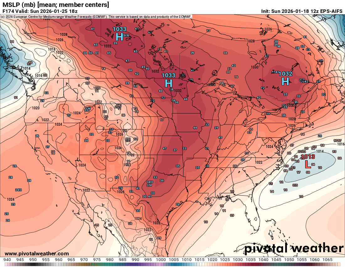 Here’s AIFS ensembles (which has been cleaning up in verification). MSLP mean is slightly south of the op aifs low position, by maybe 50 miles. But better clustering to the NW of the mean position