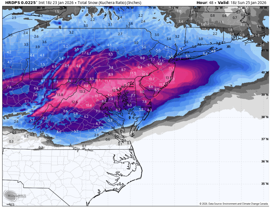 We have to watch how it plays out on Sun AM. It's going to be a very high impact storm here regardless of how much sleet we get and I'd argue even higher impact with sleet. Sleet is very tough to move and lasts longer. It will also all freeze up into a brick after it's done. The snowpack with 9-10" and sleet or 15-16" all snow has the same water content. Every model has the initial heavy thump of snow-does it stay intact like a wall or start shredding up, if it shreds up we get sleet sooner. That being said the sleet will sooner or later get here in this type of storm, always does. -
